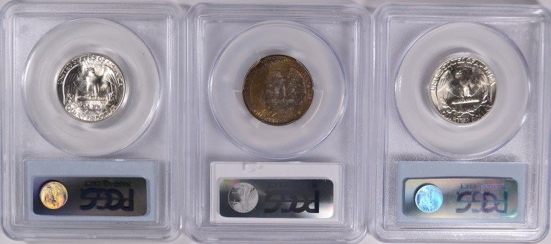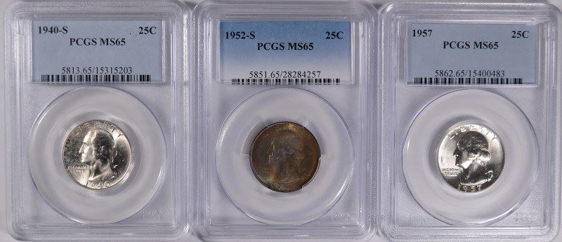 3 WASHINGTON QUARTERS 1940-S, 57, & 52-S ALL PCGS MS-65