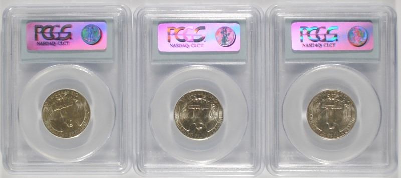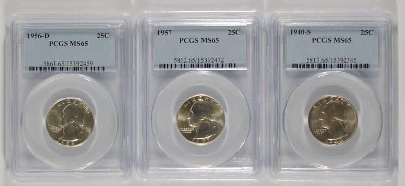 3 WASHINGTON QUARTERS 1956-D, 57, 40-S PCGS MS-65