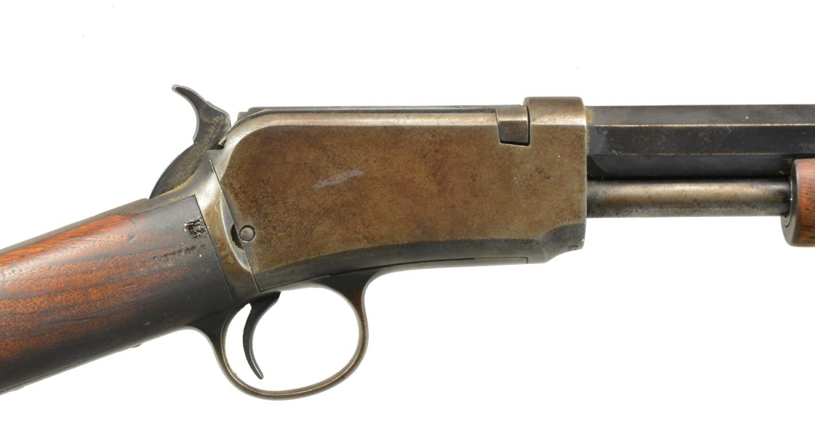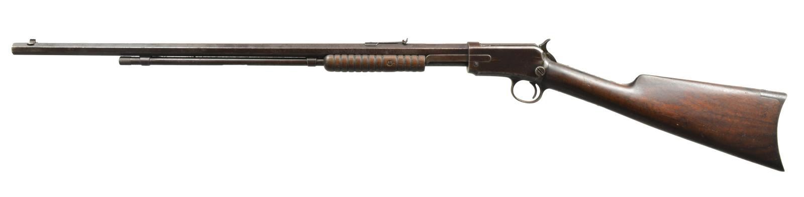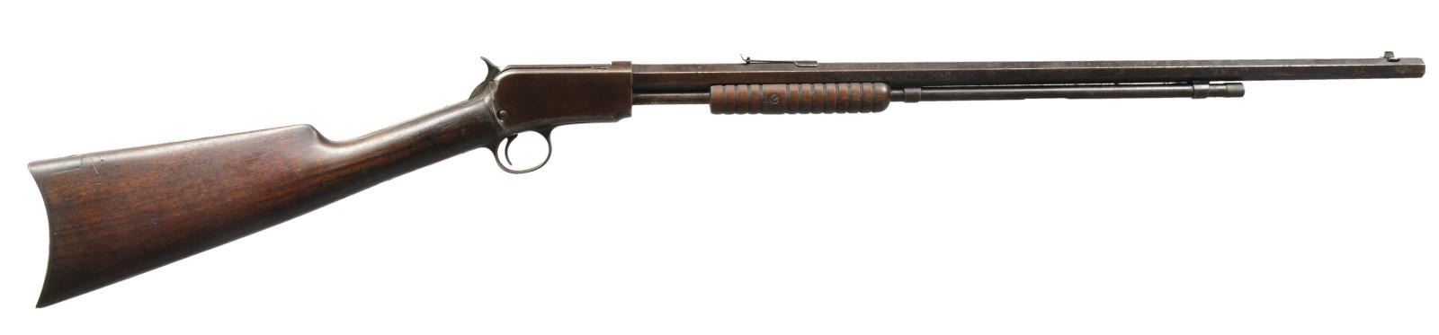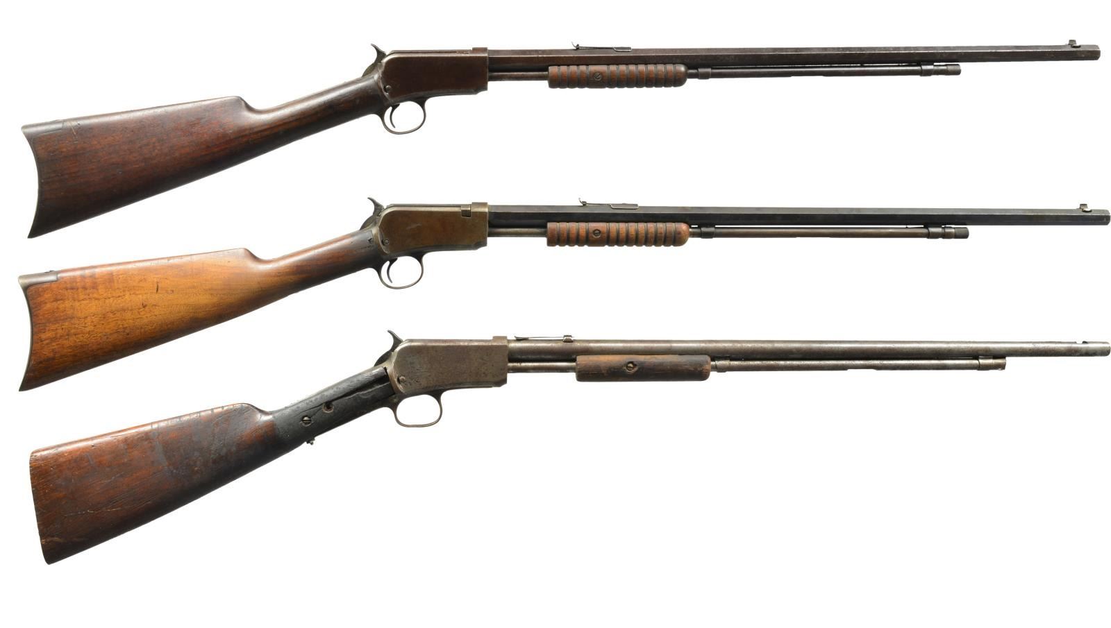 1) SECOND MODEL. Cal. 22 WRF. S# 308039. Bbl. 24" oct. w/ blade front sight & sporting rear sight. Tubular mag. Second model action has mortised breech block. Carrier has radianced top surface. Sm. grooved forearm & straight grip walnut stock w/ steel buttplate. 1907 Mfg. CONDITION: metal has faded to brown patina w/ scattered light pitting & surface corrosion. Forearm shows heavy wear w/ wood erosion. Stock has dark worn appearance w/ numerous scratches, dents & marks. Dark pitted bore. (20-2612/DS). CURIO. 2) ASSEMBLED RIFLE. Cal. 22 S, L, LR. S# 240931. Receiver & mortised bolt are 1890 Second Model. Trigger assembly & stock are Model 1906 S# "38286". Bbl. 21 3/4" rnd. marked "IVER JOHNSON SELF COCKING SAFETY RIFLE". Open front sight dovetail w/ broken rear sight. Tubular outside mag., inside mag. tube not present. 1906 Gumwood forearm & straight grip stock w/out buttplate. CONDITION: metal has gray appearance w/ general pitting & rust. Trigger guard bow is bent. Trigger & other action parts are missing. Forearm is broken w/ replacement screws. Stock is broken w/ big chips missing at head having bolt type repairs. Pitted bore. (20-2780/DS). MODERN. 3) THIRD MODEL. Cal. 22 WRF. S# 632549A. Bbl. 24" w/ original sporting sights. Tubular mag. Sm. grooved forearm & straight grip walnut stock w/ steel buttplate. CONDITION: bbl. retains 50% dull fading blue showing surface corrosion. Action & mag. tube have faded to gray brown patina showing surface corrosion. Stock & forearm has partially worn finish w/ areas of oil darkening showing numerous scratches & marks. Left forearm screw is missing. Dark pitted bore. (20-2864/DS). CURIO. $600-900.