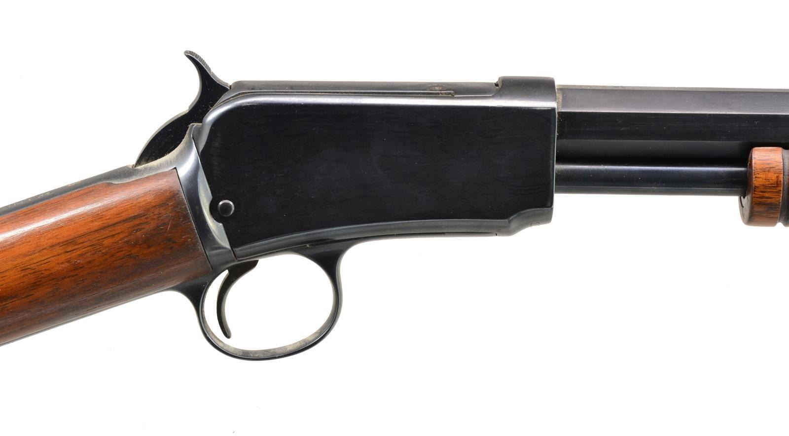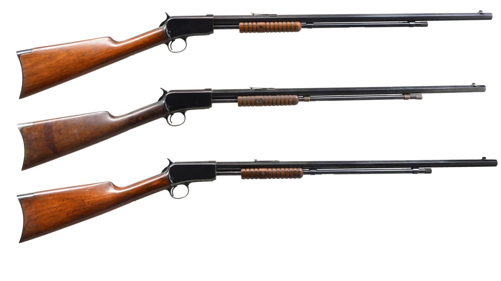 ALL: bbls. 24" oct. w/ original sporting sights. Tubular mags. 2nd Model mortised breech bolts. Grooved pump handles & straight grip walnut stocks w/ steel buttplates. 1) Cal. 22 WRF. S# 285434. CONDITION: over 95% reblued finish retaining strong markings. Forearm & stock have good refinish showing some handling marks. Action exhibits some wear. Pitted bore. (20-2478/DS). 2) Cal. 22 Long. S# 223297. CONDITION: 80% lightly worn reblued finish showing scratches & marks w/ cold blued bbl. bands. Forearm & stock have worn finish showing scratches, dents & handling marks. Stock is cracked at head w/ plug type repair. Original buttplate finish has faded to gray showing spots of corrosion. Smooth mechanics. Bore retains sound rifling showing sm. spots of pitting. (20-2480/DS). 3) Cal. 22 Short. S# 246850. CONDITION: 80% reblued finish showing wear on trigger guard tangs. Stock & forearm have heavy coat of added finish over scratches & handling marks. Action has slightly stiff operation. Lightly pitted bore. (20-2486/DS). ALL CURIO. $1,000-1,500.