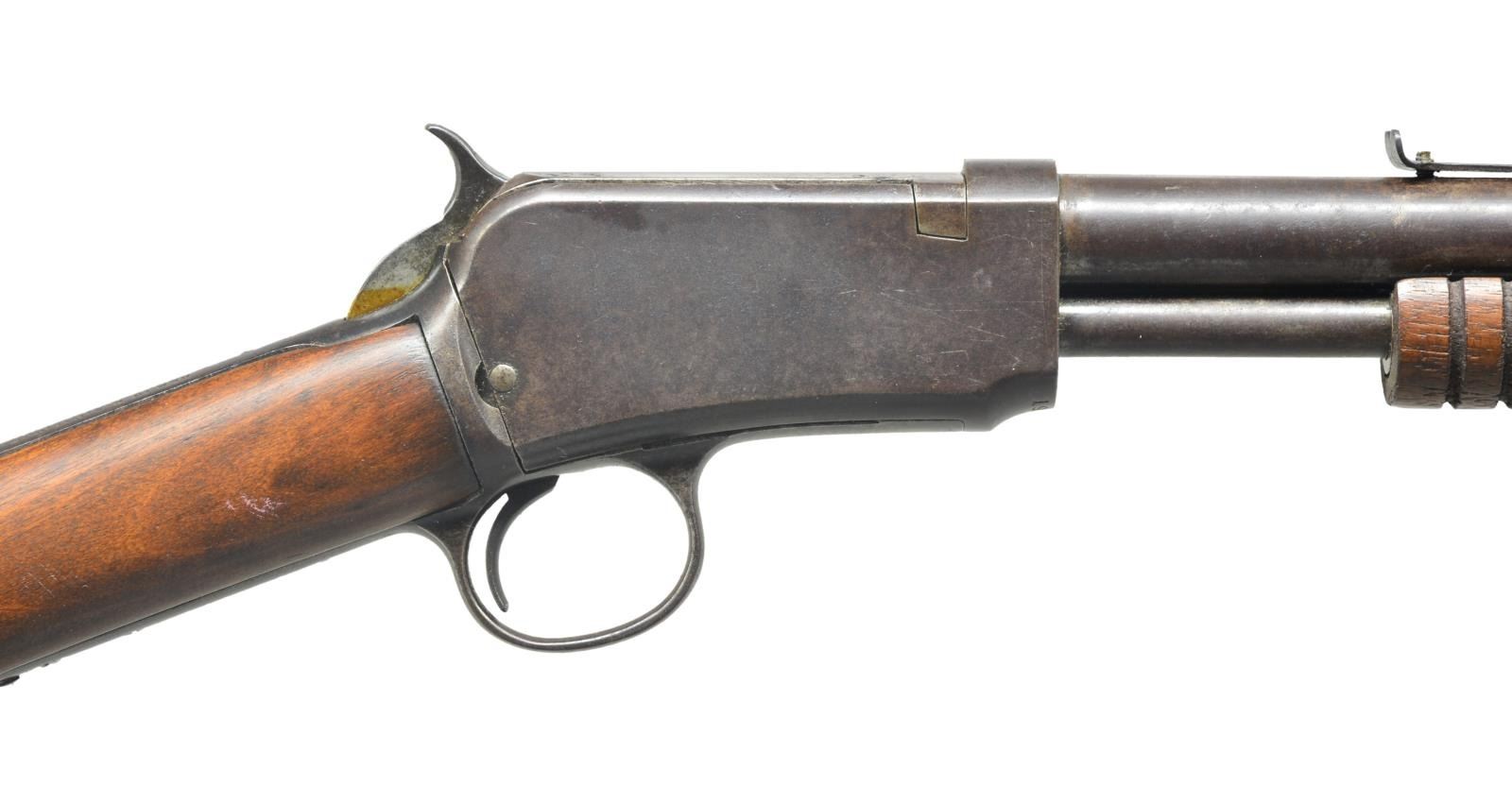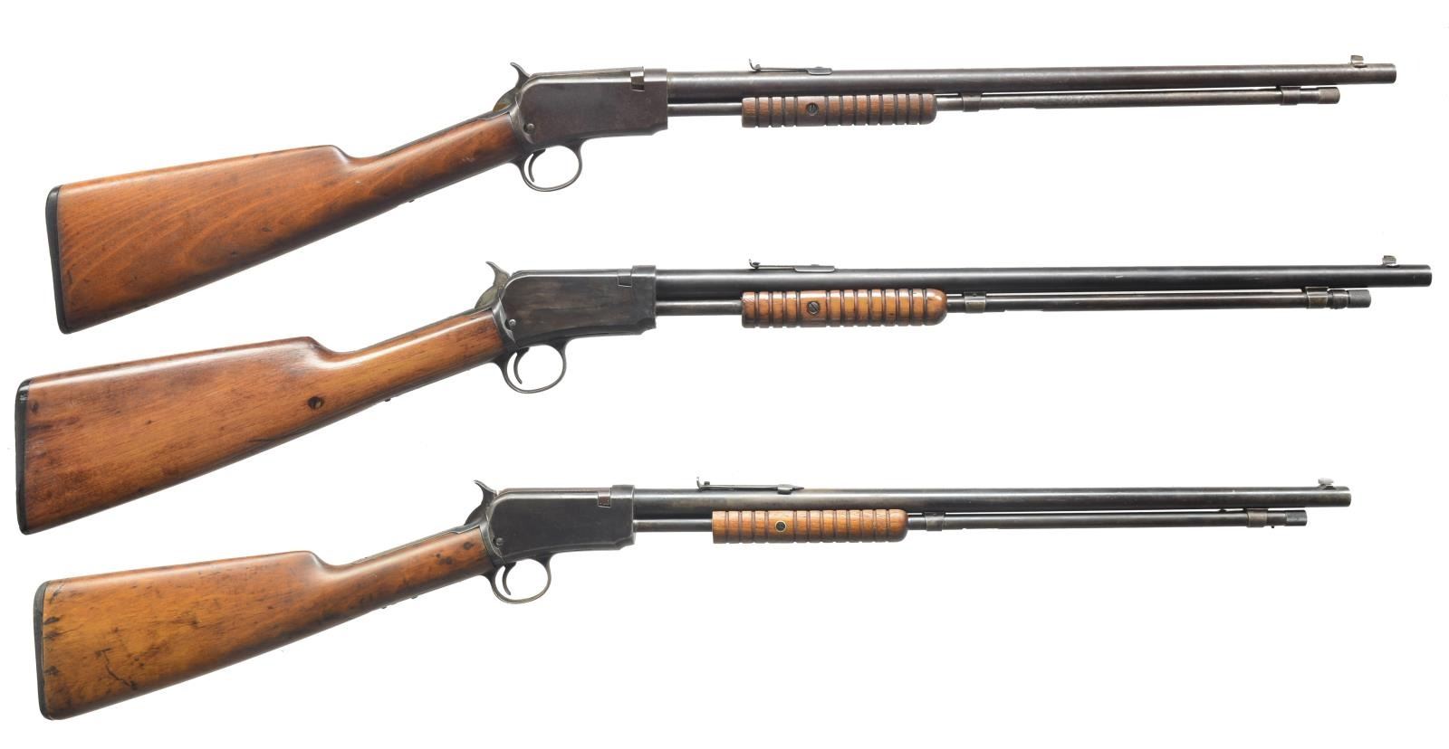 ALL: cal. 22 S, L, LR. Bbls. 20". Tubular mags. Grooved pump handles & straight grip gumwood stocks w/ wagon wheel buttplates. 1) S# 193719. Factory sights, front sight has 1902 patent date, rear sight has 1901 patent date. CONDITION: action retains sm. amounts of original blue w/ balance of action, bbl. & mag. tube fading to brown patina showing areas of surface corrosion & light pitting. Sanded & refinished wood shows dents & handling marks. Pitted bore. (20-3534/DS). 2) S# 763859. Replacement bead front sight w/ original rear sight. CONDITION: bbl. action & mag. tube have dull cold blue finish. Slide bar cover is gray. Stock & forearm are sanded & have gloss refinish. Stock is split through head & wrist area w/ screw type repairs. Relined bore w/ strong rifling. (20-3535/DS). 3) S# 159921. Replacement blade front sight w/ replacement sporting rear sight having set screw for adj. CONDITION: metal has cold blue finish over sm. dents & polishing marks. Top of receiver has 1 added hole w/ brass plug screw. Pump handle is a walnut replacement w/ replacement screws. Refinished stock shows dents & handling marks w/ spots of epoxy fill over screw type repairs at split head. Pitted bore. (20-3537/DS). ALL CURIO. $700-1,000.