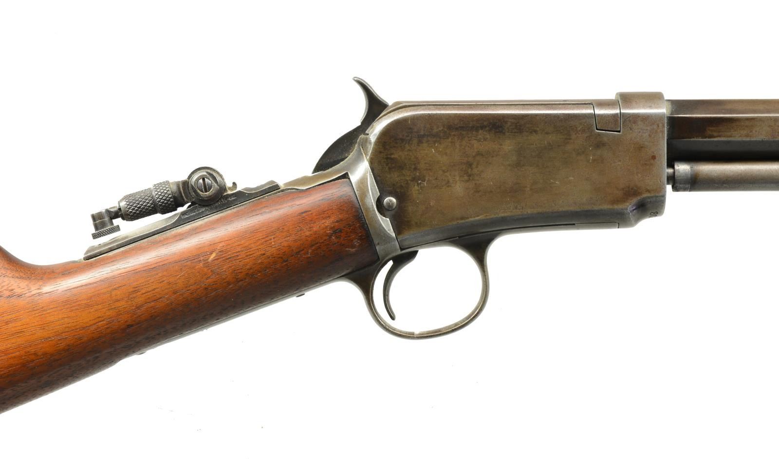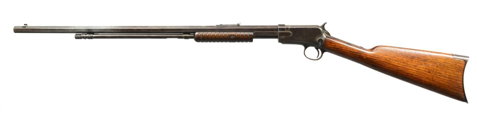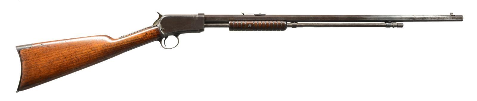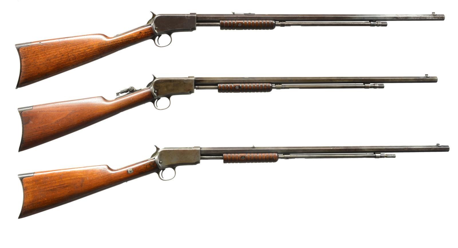 ALL: cal. 22 Short. Bbls. 24" oct. Grooved walnut pump handles w/ straight grip walnut stocks having crescent steel buttplates. 1) 3RD MODEL. S# 564854A. Bead front sight w/ sporting rear sight. Tubular mag. Trigger guard has mismatched S# "537327". CONDITION: metal has faded brown appearance w/ general light pitting. Loading port on outside mag. tube is enlarged. 1 Breech block screw is missing. Tang screw & mainspring screw are replacements. Wood is heavily sanded & undersized w/ worn refinish showing scratches & handling marks. Action has stiff operation. Dark pitted bore. (20-2479/DS). 2) 3RD MODEL. S# 806635. Sporting front sight, filler in rear dovetail w/ Marbles flexible tang sight. CONDITION: metal has gray coloration indicating touch up finish showing scattered light pitting. Mag. retainer spring & pin are missing. Bore is bright w/ strong rifling. (20-2481/DS). 3) 2ND MODEL. S# 161315. Blade front sight w/ fixed V notch rear sight. Mortised breech bolt. Replacement outside & inside mag. tube. CONDITION: metal has mottled gray brown appearance w/ areas of pitting. Forearm has worn finish & is broken down the middle w/ a glued repair. Sanded & refinished stock is split at head w/ bolt & plug type repairs. Lightly pitted bore. (20-2485/DS). ALL CURIO. $750-1,100.