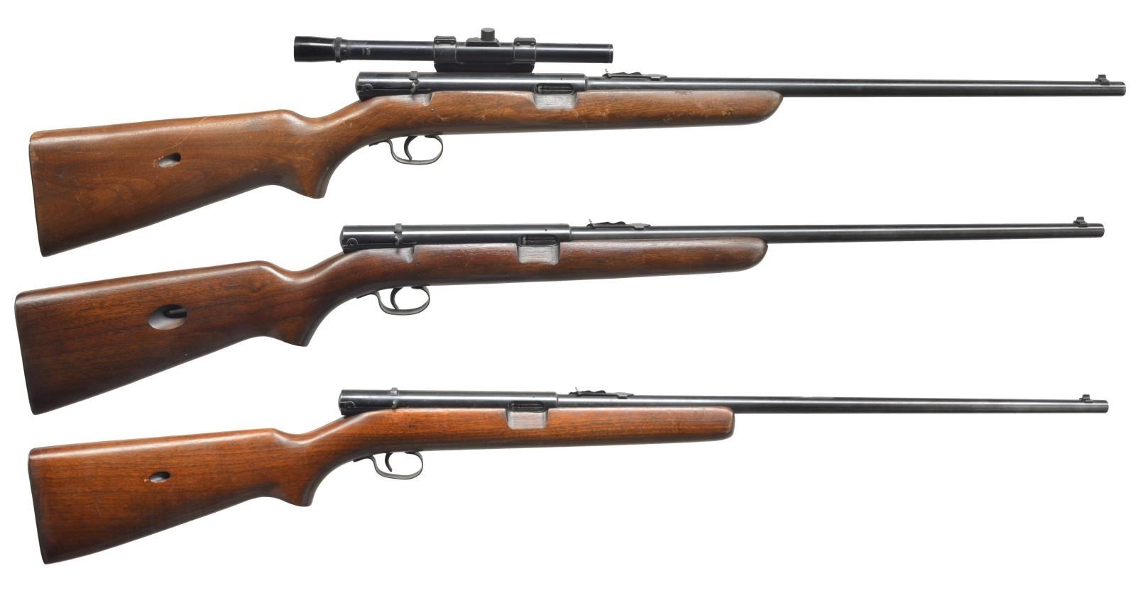 SCOPE. 1) MODEL 74 W/ SCOPE. Cal. 22 LR. S# 194143A. Bbl. 22". Standard configuration. Fitted w/ pressed steel front sight. Winchester markings on top left. Steel receiver w/ safety on top. Tubular mag. loads through hole in right side of butt. Pistol grip stock of plain American walnut, uncheckered. Rifle is fitted w/ 4X Japanese "Monoscope" in pressed steel mount. CONDITION: very good retaining over 90% original finish on all surfaces. Shiny bore. Scope is somewhat cloudy. (20-3552/MGM). CURIO. 2) FINE CONDITION MODEL 74. Cal. 22 LR. S# 329308A. Bbl. 22" standard configuration. Pressed steel rear sight & silver bead front. Semi-automatic action w/ safety slide on top. Plain American walnut pistol grip stock w/ tubular mag. loading through right side of butt. CONDITION: very fine, retaining nearly all factory finishes w/ only a few scattered handling marks. Bright shiny bore. (20-3553/MGM). CURIO. 3) WAR TIME PRODUCTION MODEL 74. Cal. 22 LR. S# 123320 (circa 1942). Bbl. 24" w/ pressed steel rear sight & silver bead front. Winchester markings & "22 Long Rifle" (introduced 1940). Steel receiver w/ sliding safety on top. Fiddle figured American walnut pistol grip stock w/ tubular mag. loaded through sm. hole on right side of butt. CONDITION: fine, retaining over 90% original factory finishes w/ a fair number of handling marks on stock. Bright shiny bore. (20-3554/MGM). CURIO. $550-750.