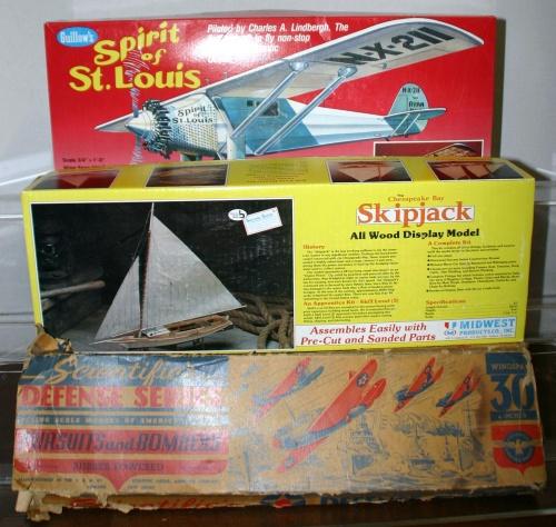 3 WOOD MODEL KITS. 1 GUILLOWS SPIRIT OF ST. LOUIS, MIDWEST SKIPJACK BOAT, SCIENTIFICS DEFENSE SERIES RUBBER POWERED PURSUITS AND BOMBERS. KITS NOT CHECKED FOR COMPLETENESS.