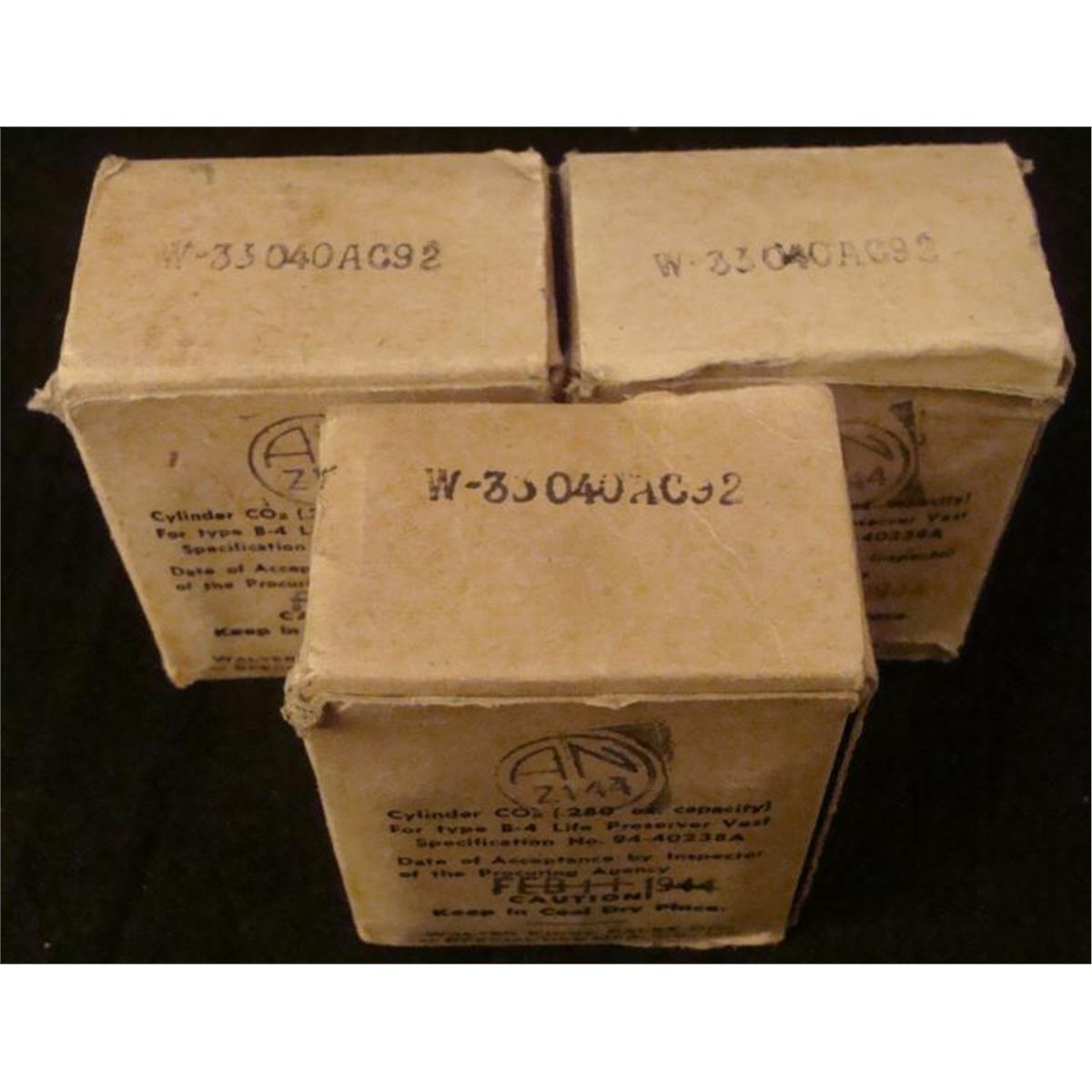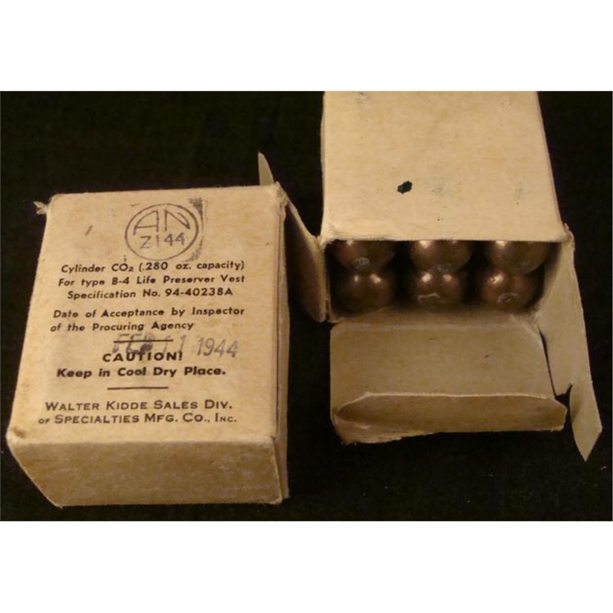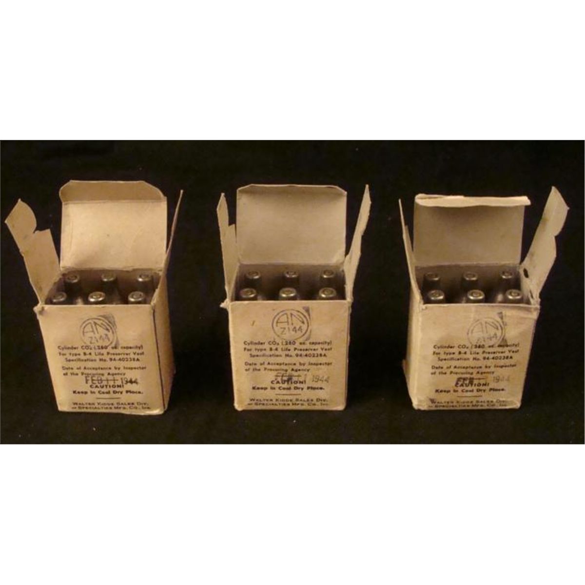 3 WWII 1944 AAF US GI "CO2" PACKAGES FOR B-4 LIFE PRESERVER VESTS-3 PKGS OF 6 IN EACH * 3 UN-USED WWII AAF PACKAGES OF 6 EACH METAL CO2 CYLINDERS (.280 OZ CAPACITY) FOR TYPE B-4 LIFE PRESERVER VESTS-INSPECTION DATE FEB 11, 1944--MAKER: WALTER KIDDE SALES DIV OF SPECIALTIES MFG CO, INC. - RARE UN-USED WWII ITEMS-18 TOTAL PIECES INORIG CARTONS *