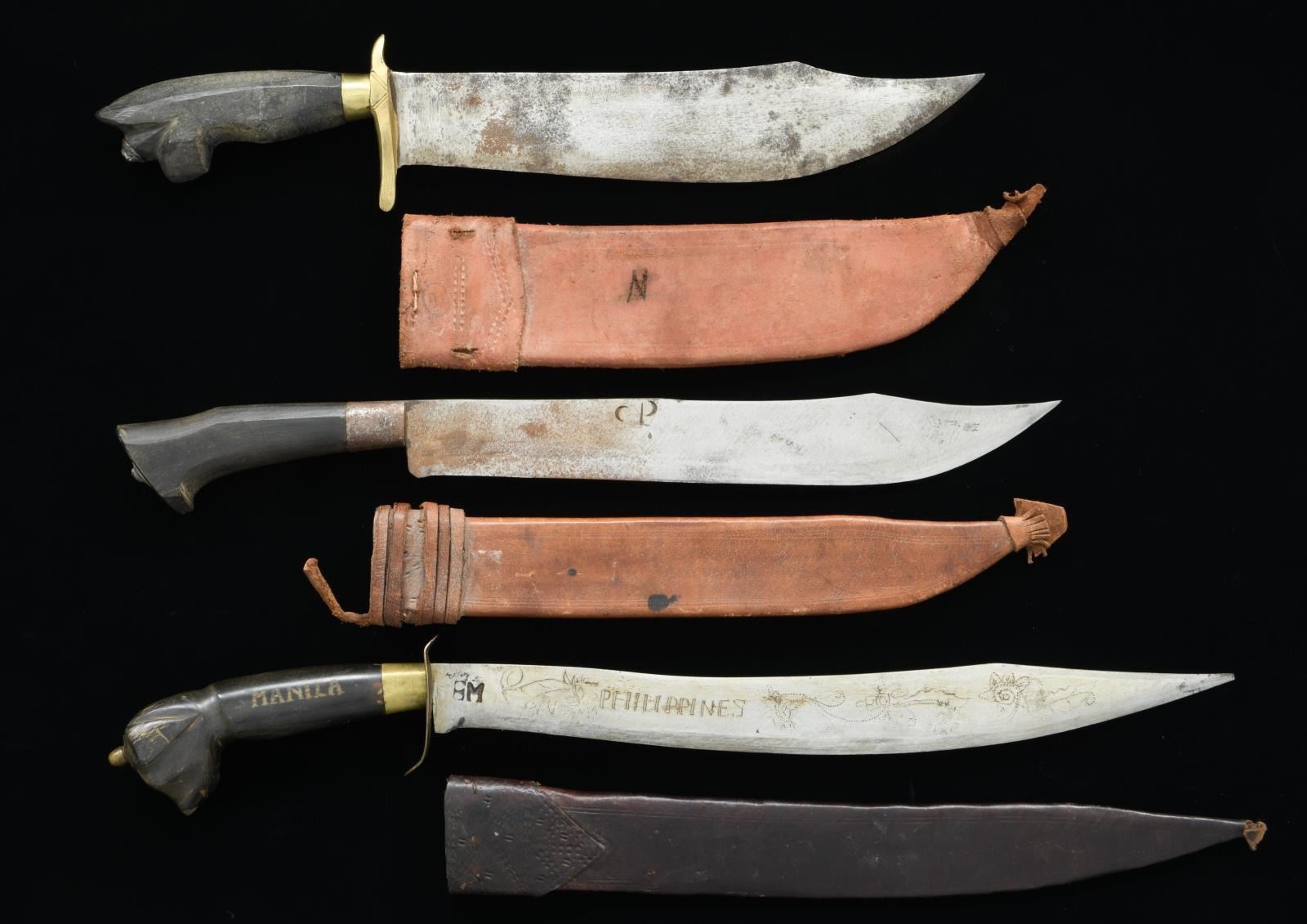 1) Overall length: 24". Blade length: 16 3/4". Blade is engraved with various foliate motifs and the word "PHILIPPINES". The handle is carved wood with the pommel being a dog head effigy. The side of the grip reads "MANILLA" & "OTC. 25, 1945". Leather sheath. CONDITION: light wear overall. 2) Overall length: 20". Blade length: 13 3/4". Blade has a 4" false edge and is stamped "CP" near the spine. Carved wood handle. Brown leather sheath. CONDITION: light to moderate wear overall. 3) Overall length: 20". Blade length: 12 1/2". Blade has a 4" false edge. At the top of one side of the knife, there is an engraving that reads "Philippines". Brass crossguard. Carved wooden grip. Brown leather sheath. CONDITION: light wear overall. (02-19611-26/BF). $150-300.