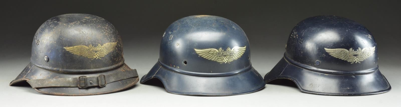 2) LUFTSCHUTZ. An example of a gladiator style Luftschutz helmet with a very dark blue painted finish. There is a Luftschutz decal on the front of the helmet. 9 Tongue brown leather liner stamped "56". Black leather chinstrap. The rear interior of the helmet has a decal that reads, "Vertribe genehmight gemass 8 Luftschutzgesetz Kopfweite 56". The inside rear also has white writing that reads, R.L 2-39/2". CONDITION: helmet retains approx. 75% of its original finish. The decal is approx. 90%. Liner shows light to moderate wear. Chinstrap shows light wear.