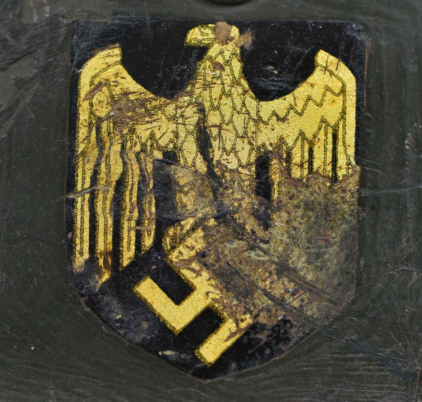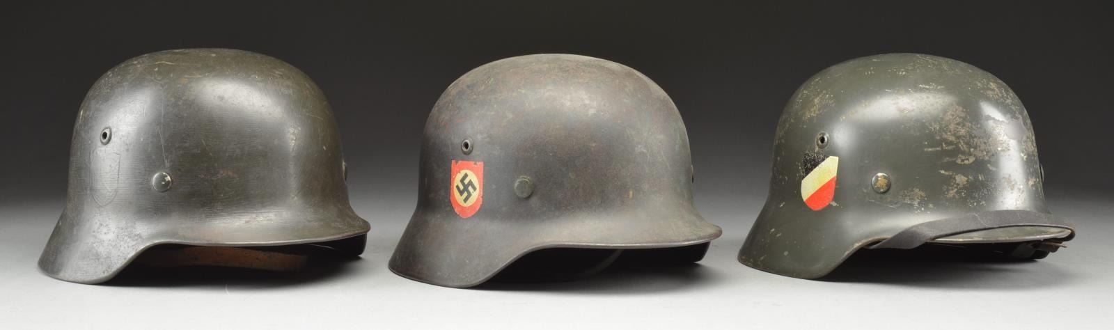 2) POLICE. A fine M35 German Police helmet w/ a rolled rim & riveted air vents. Helmet has a deep field green painted finish w/ a Police decal on the left & Party symbol decal on the right. 8 Tongue dark brown liner w/ black chinstrap. Inside left of helmet is stamped, "Q62". Inside rear of helmet is stamped, "256". The inside of the helmet has a white painted identification to "K. Kolsch" along w/ a shield w/ the top left corner missing showing a letter "Z" in the center. CONDITION: helmet finish is approx. 85%. Police decal is 85%. Party decal is approx. 90%. Liner & chinstrap show moderate wear.