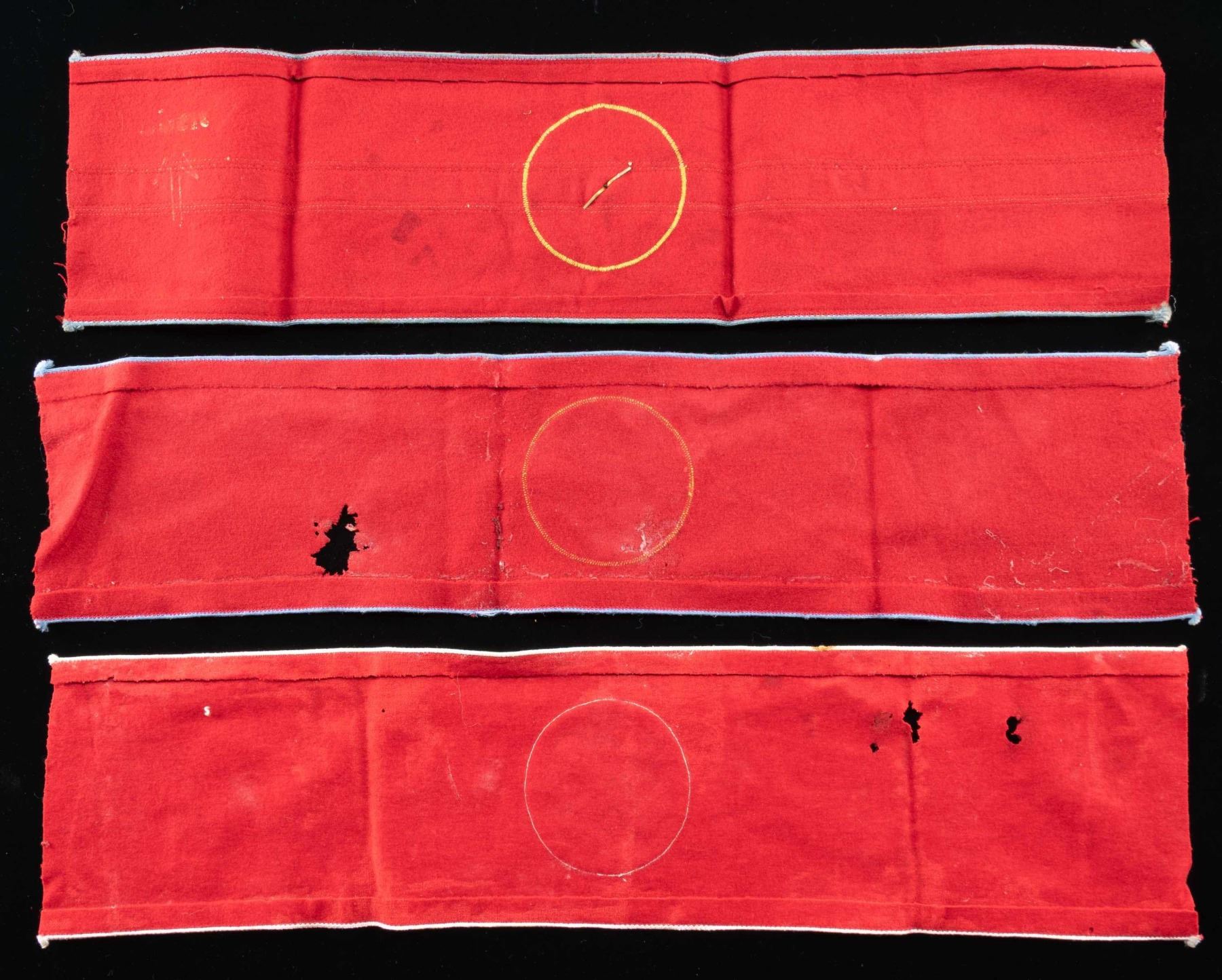 This group of 3 WWII German Political Leader armbands include 1 Kries level administrative armband. / 1 Orts level local leader candidate's armband. / 1 Orts level Group Leader's armband. CONDITION: the Orts Group Leader armband shows light wear and the others show some moth damage. (02-24909/BF). $500-800.