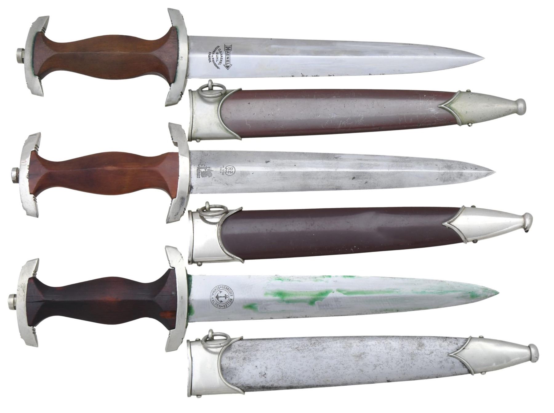 1) HAENEL. This dagger measures 14 5/8" overall, and the blade is etched "Alles fur Deutschland". The blade is marked on the opposite side "HAENEL (in arrow) C.G. HAENEL SUHL WAFFEN-u. FAHRRAD. FABRIK". Nickel silver crossguard stamped "Sa" with a nickel silver pommel guard. Brown wooden grip with nickel silver eagle and brown enameled SA button. Scabbard has a brown anodized silver with nickel silver mounts. CONDITION: blade shows primarily scabbard wear. Hilt and scabbard show light wear overall. 2) EICKHORN. This dagger measures 14 3/4" overall, and the blade is etched "Alles fur Deutschland". The blade is marked on the opposite side "RZM M 7/66 1939" and "(squirrel) Eickhorn SOLINGEN". Plated crossguard with a plated pommel guard. Brown wooden grip with a plated eagle and brown enameled SA button. Scabbard has a brown painted finish with plated mounts. CONDITION: blade does show wear and has a light gray patina. Hilt shows light wear overall; however, there is a 3/8" x 1/2" chip in the grip near the crossguard. Scabbard has two very shallow dents. 3) HELLER. This dagger measures 14 1/2" overall, and the blade is etched "Alles fur Deutschland". The blade is marked on the opposite side "GEBRUDER HELLER (logo) SCHMALKALDEN". Nickel silver crossguard stamped "Mi" on the reverse, with a nickel silver pommel guard. Brown wooden grip with a nickel-silver eagle and brown enameled SA button. Scabbard has no finish remaining. CONDITION: blade shows primarily scabbard wear. Mounts show light wear. Grip is cracked with some minor losses. Scabbard has had its finish removed. (02-23214-2/BF). $800-1,100.