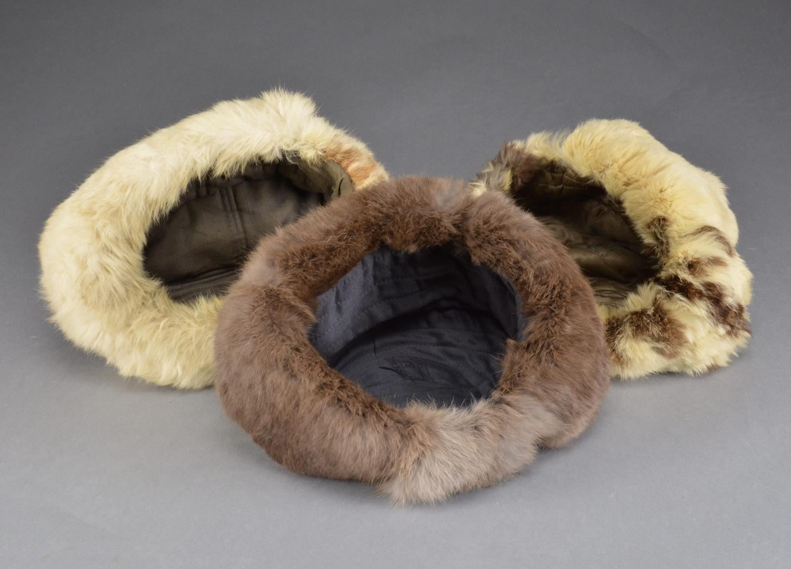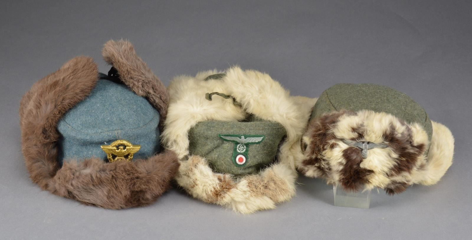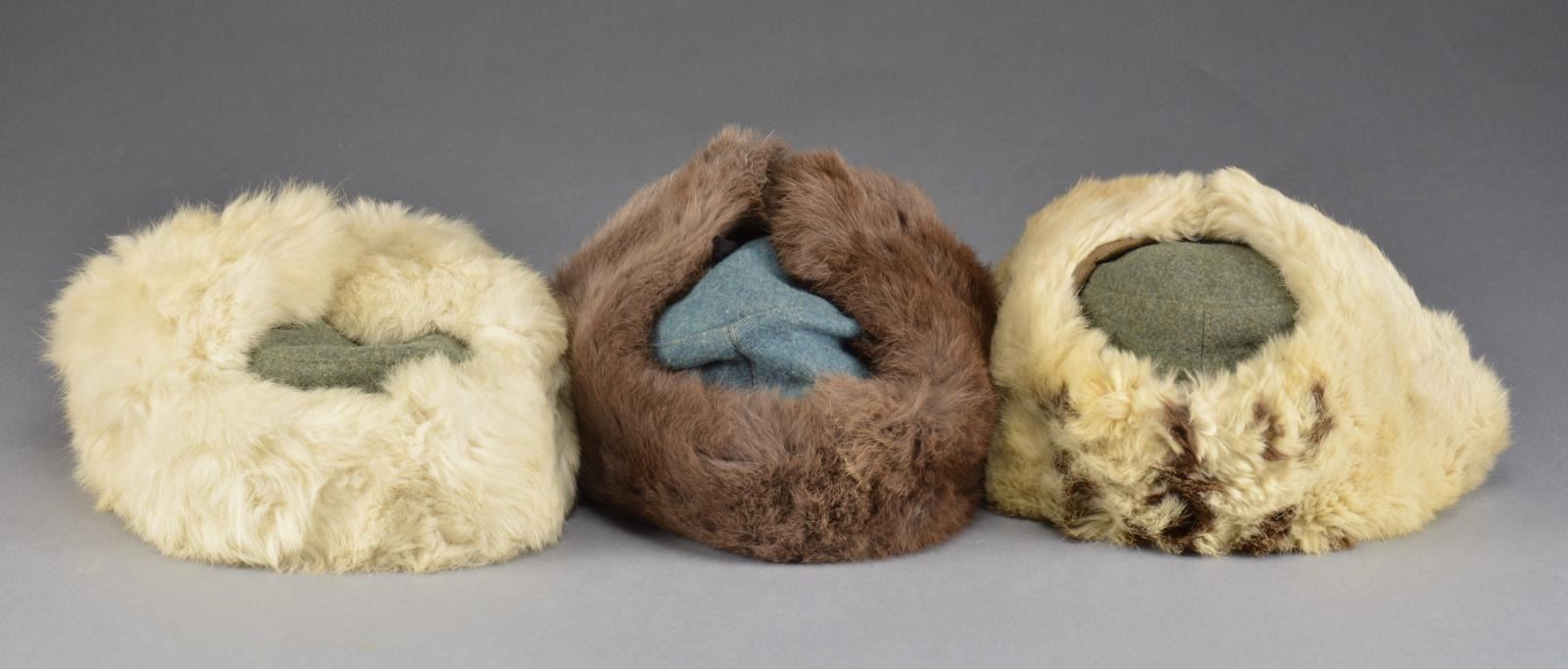 1) Water Protection Police green wool hat w/ brown rabbit fur flaps & front. Cap features a heavy green wool body w/ gold Water Protection Police eagle on the front. Quilted gray interior has a stamp that reads, “H.B._ _ 0/1200/0147 58 1944”. CONDITION: hat shows light wear overall. 2) Customs green wool hat w/ white & brown rabbit fur flaps & front. Cap features a heavy green wool body w/ sewn on flat bullion customs eagle over National Cockade. Quilted gray/green interior is unmarked. CONDITION: hat shows light overall wear. Interior has noticeable sweat stains. 3) Army green wool hat w/ white & brown rabbit fur flaps & front. Cap features a heavy light green wool body w/ silvered metal Army eagle on the front. Quilted gray/green interior is stamped size “56” & dated 1942. A rectangular stamp in the center of the interior is illegible, likely due to ink running from sweat. CONDITION: ties at top are partially missing. Hat shows light to moderate wear overall. Interior has noticeable sweat stains. (02-14156/BF). $700-1,000.