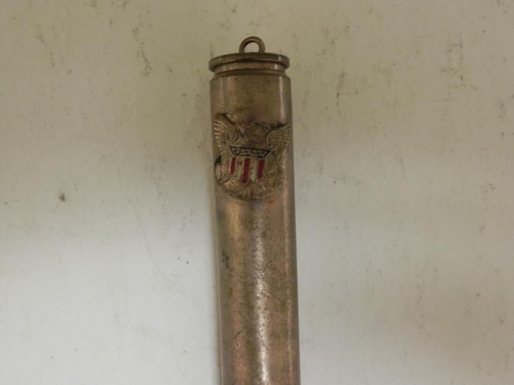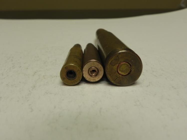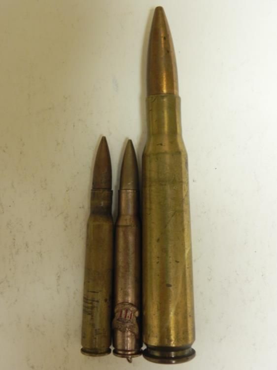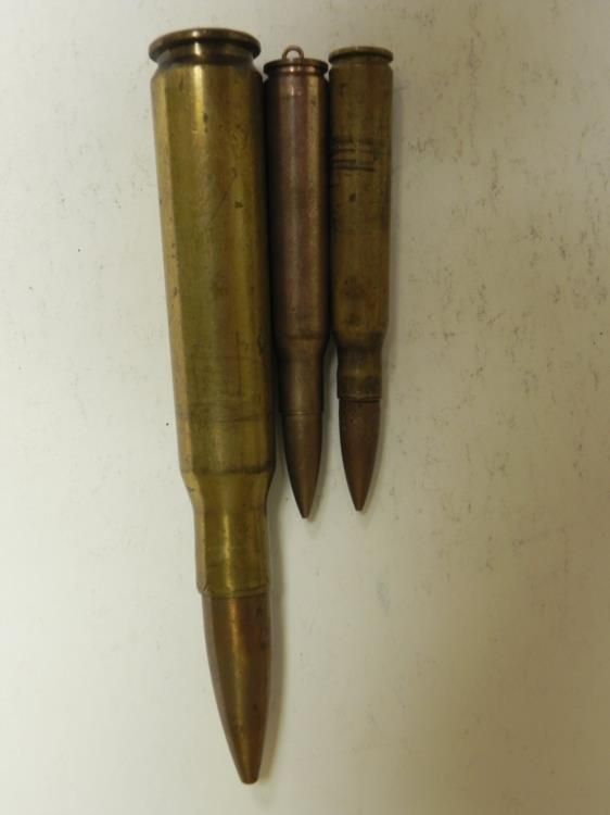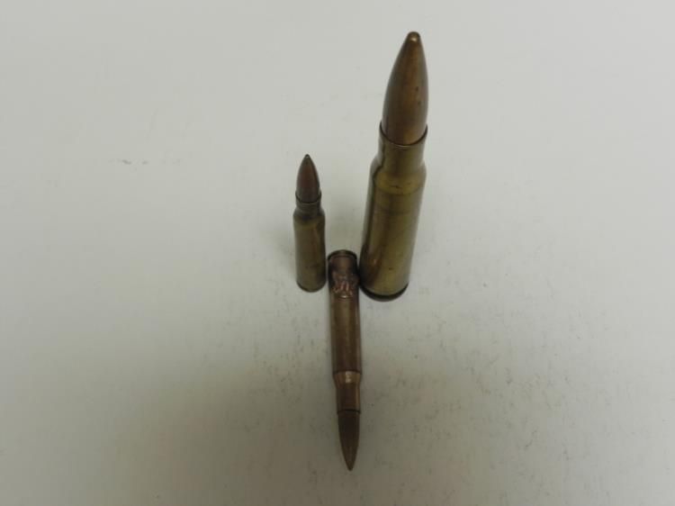 HERE ARE 3 WWII RIFLE AND ARTILLERY BULLETS-ONE HAS US INSIGNIA SOLDERED ON.ARTILLERY SHELL MARKED "TW 43"-5 1/2" LONG---OTHER 2 ARE 3 1/4".