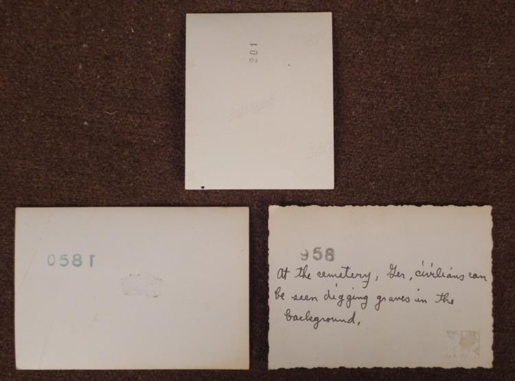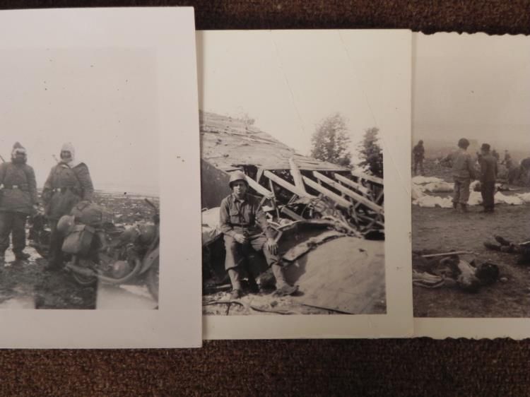 3 WWII-WAR'S END PHOTOS-NAZI PLANE DOWN-GERMAN CIVILIANS DIGGING GRAVES-2 NAZI'S W/MOTORCYCLE * * 3 GREAT ORIGINAL PHOTOS--2 TAKEN BY A GI AND 1 CONFISCATED FROM NAZI PRISONER--ONE SHOWS DEAD GERMANS AT WARS END AND CIVILIAN GERMANS MADE TO DIG GRAVES FOR THEM (NOTED ON PHOTO BACK)--2ND-A GI SITTING ON THE REMAINS OF A CRASHED MESSERSCHMITT PLANE--3RD-TAKEN BY A GERMAN SHOWS TWO NAZI WEHRMACHT IN WINTER GEAR STANDING BY A NAZI MOTORCYCLE WITH HELMET ATTACHED TO THE CYCLE *
