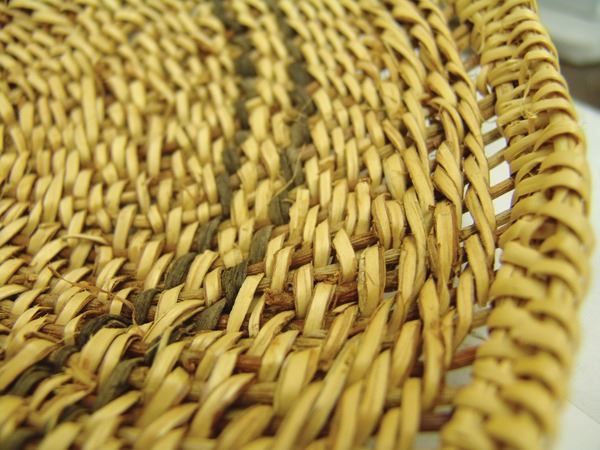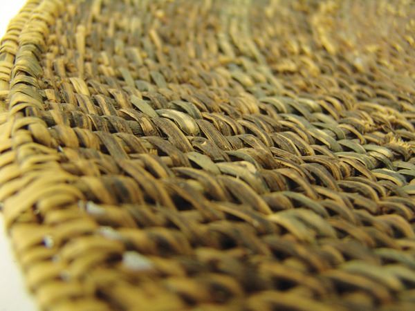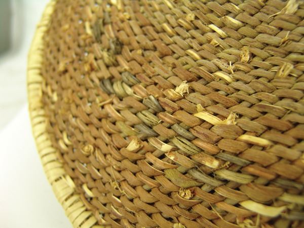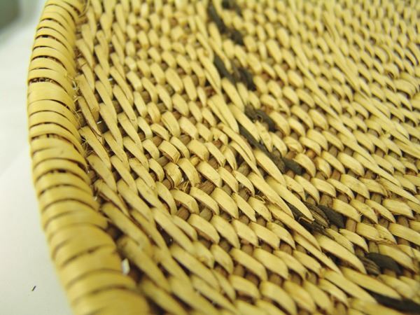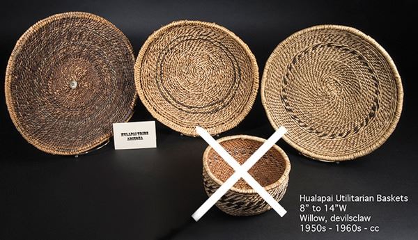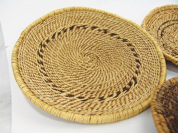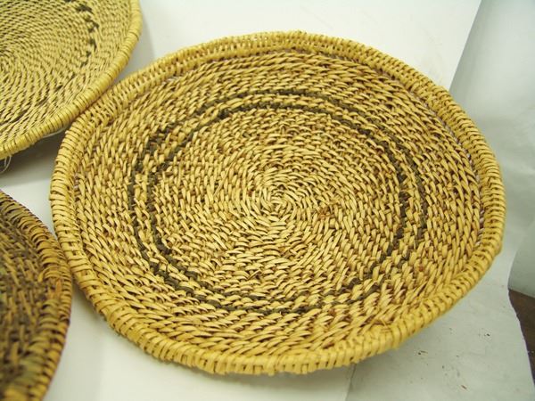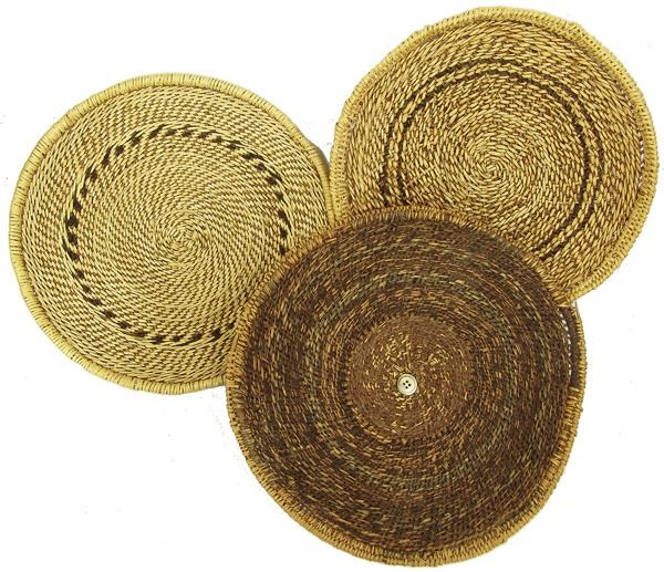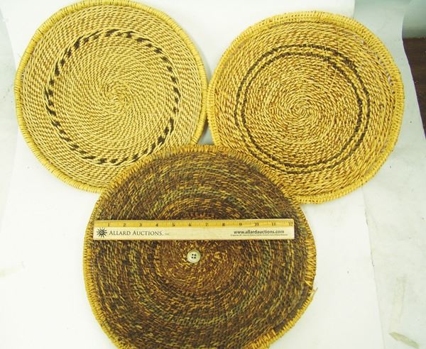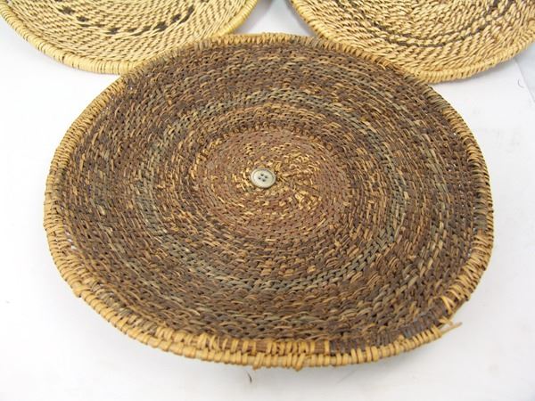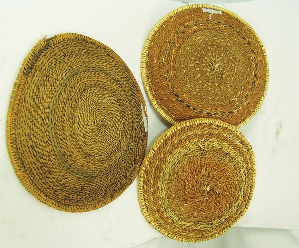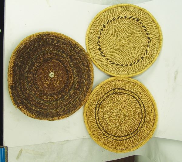 Group of three traditional utility baskets, all plaques, done in twined weave with devil's claw designs, one done in complete reverse.Mid 1900s12" to 13"