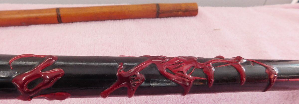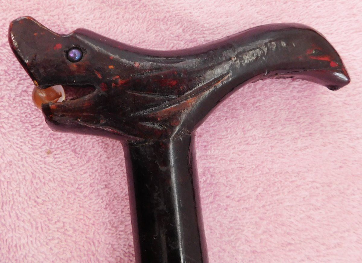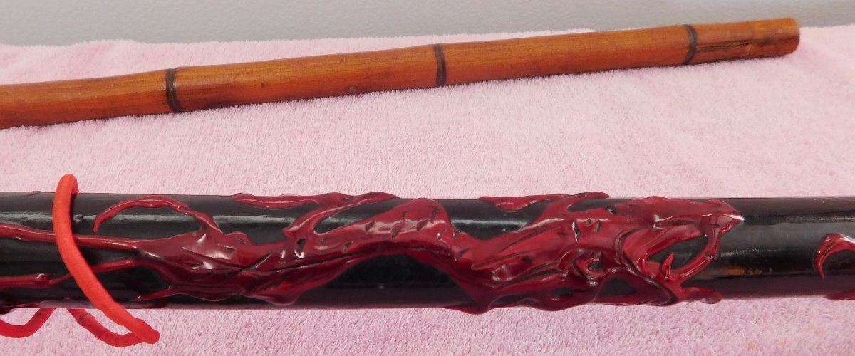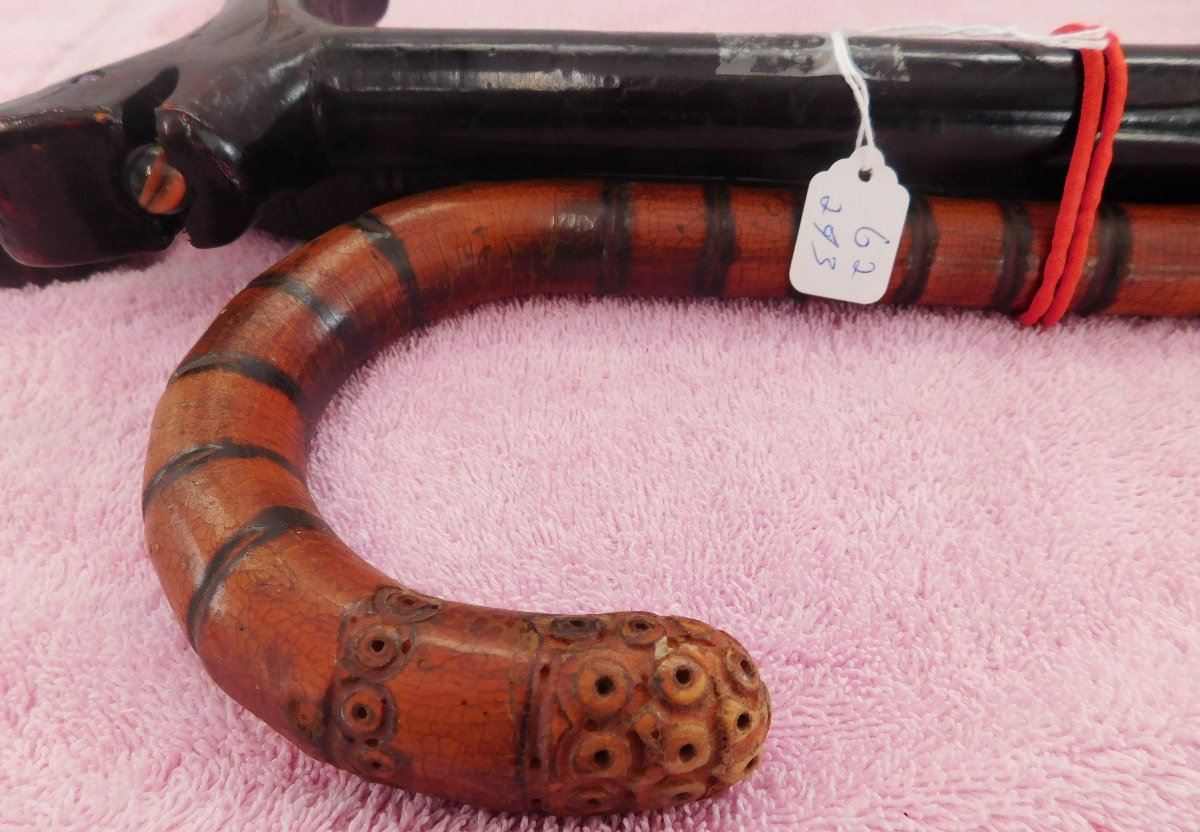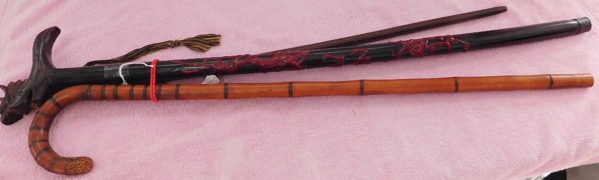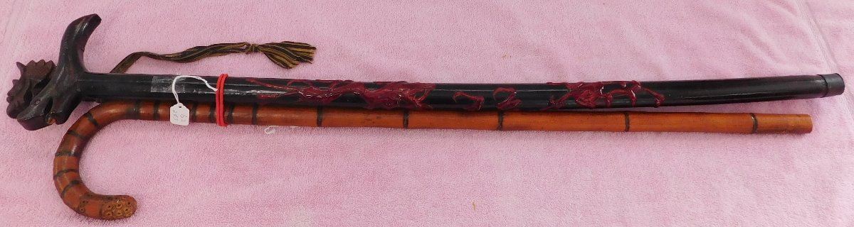 3 Walking Canes, circa WWII. Made of wood, bamboo and paint, the items measure 32.5" to 36" long. From China. Nice group of usable canes, some figures, nice paint. Condition: Good, see images. Shipping: $30.00 due to length.
