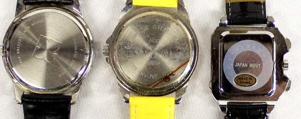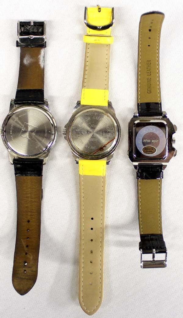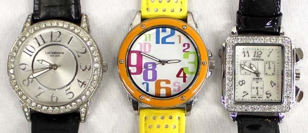 3 Watches, includes 1. Bright Yellow Band Watch, Stainless Steel Back 2. Geneva Rhinestone Watch, Stainless Steel Back 3. Liz Claiborne Watch, Stainless Steel Back, largest watch face measures 1 7/8'' x 1.75''