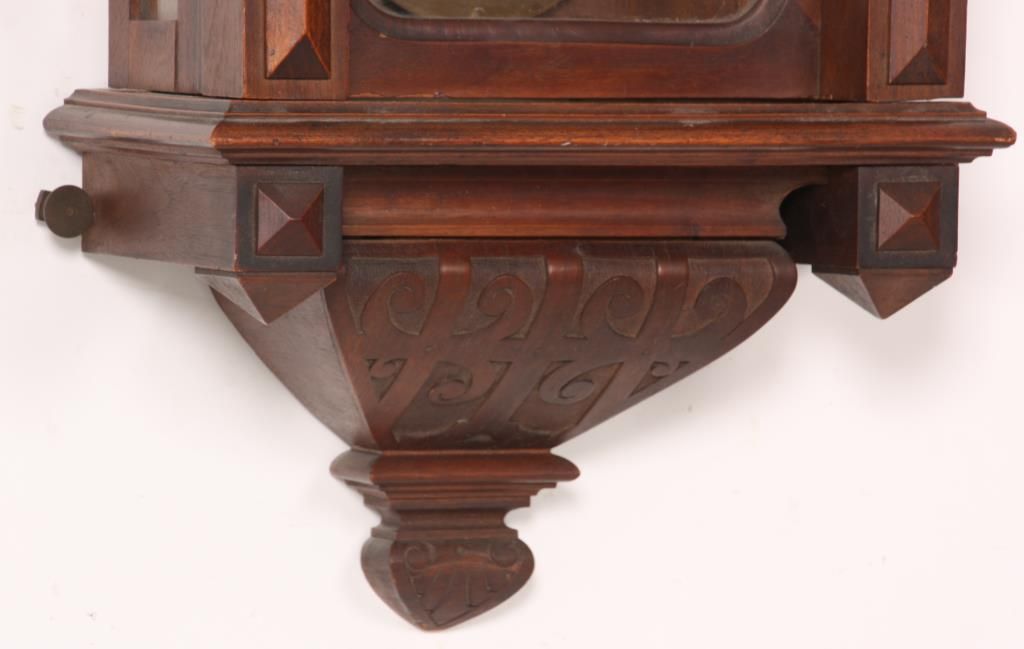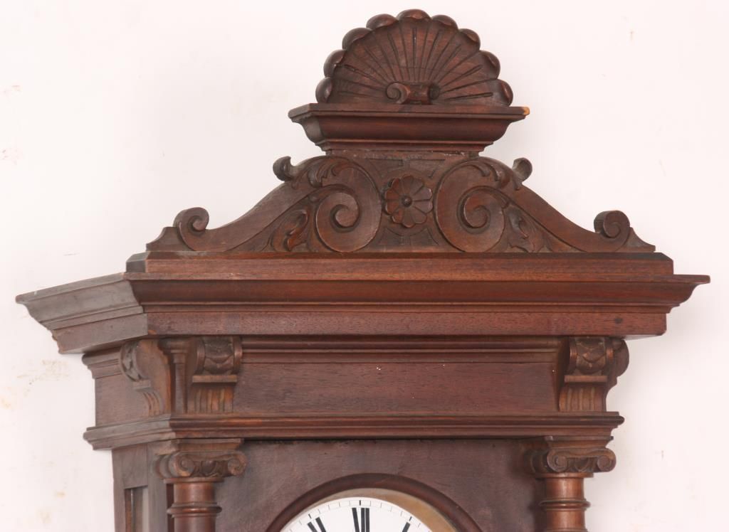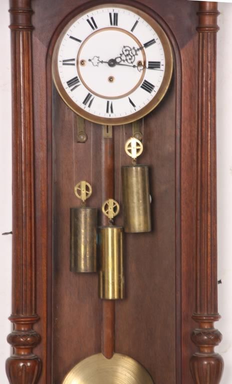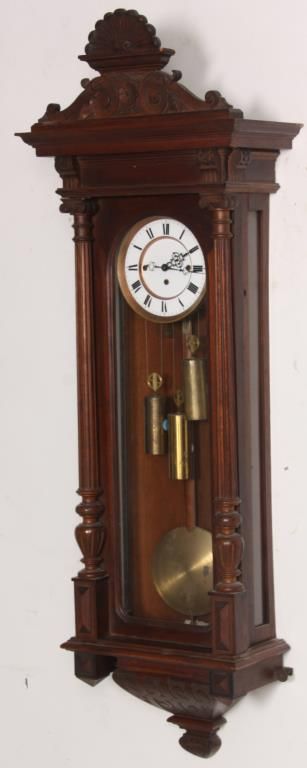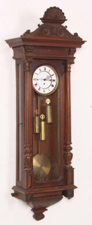 3 Weight Vienna Regulator Clock. 6.5 in. inset porcelain dial with brass bezel, Roman hour numerals and fancy pierced hands; 3 weight driven movement has brass plates, quarter hour Grand Sonnerie strike with rack and snail strike mechanism on 2 coiled gongs, has quality brass covered weights, brass pulleys, brass covered pendulum bob and wood stick. In a walnut case with shell & filigree carved crest, fluted columns and carved lower bracket. 51 in. high x 17 in. wide x 7.5 in. deep.