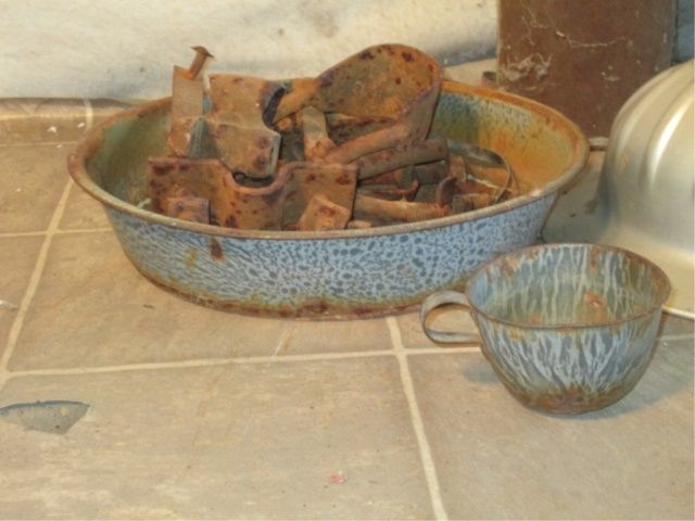 Rusty Oil Can, Porcelain Bowl With Rusty Piece W/ Cup And Shiny Metal Hard Hat