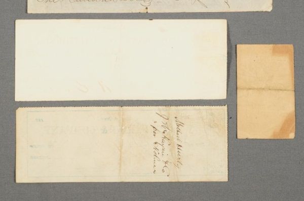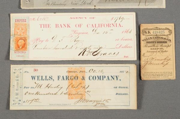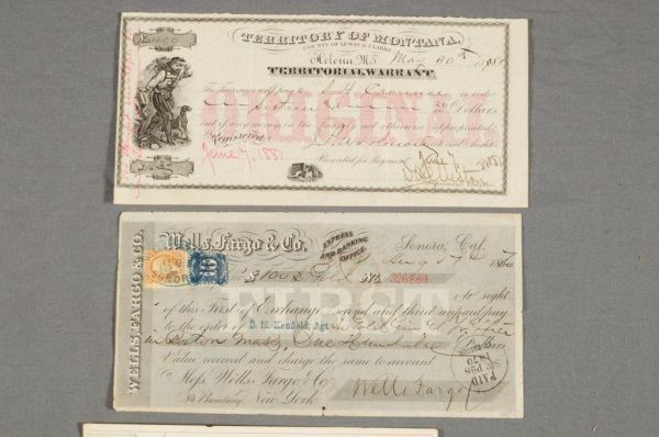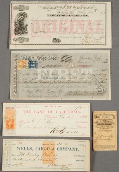 3 Wells Fargo Documents, 2 Bank Warrants/Checks. 2 Wells Fargo Checks, 1 Wells Fargo Money Order Receipt Stub, 1 Bank of California Check, and 1 Territory of Montana Warrant.