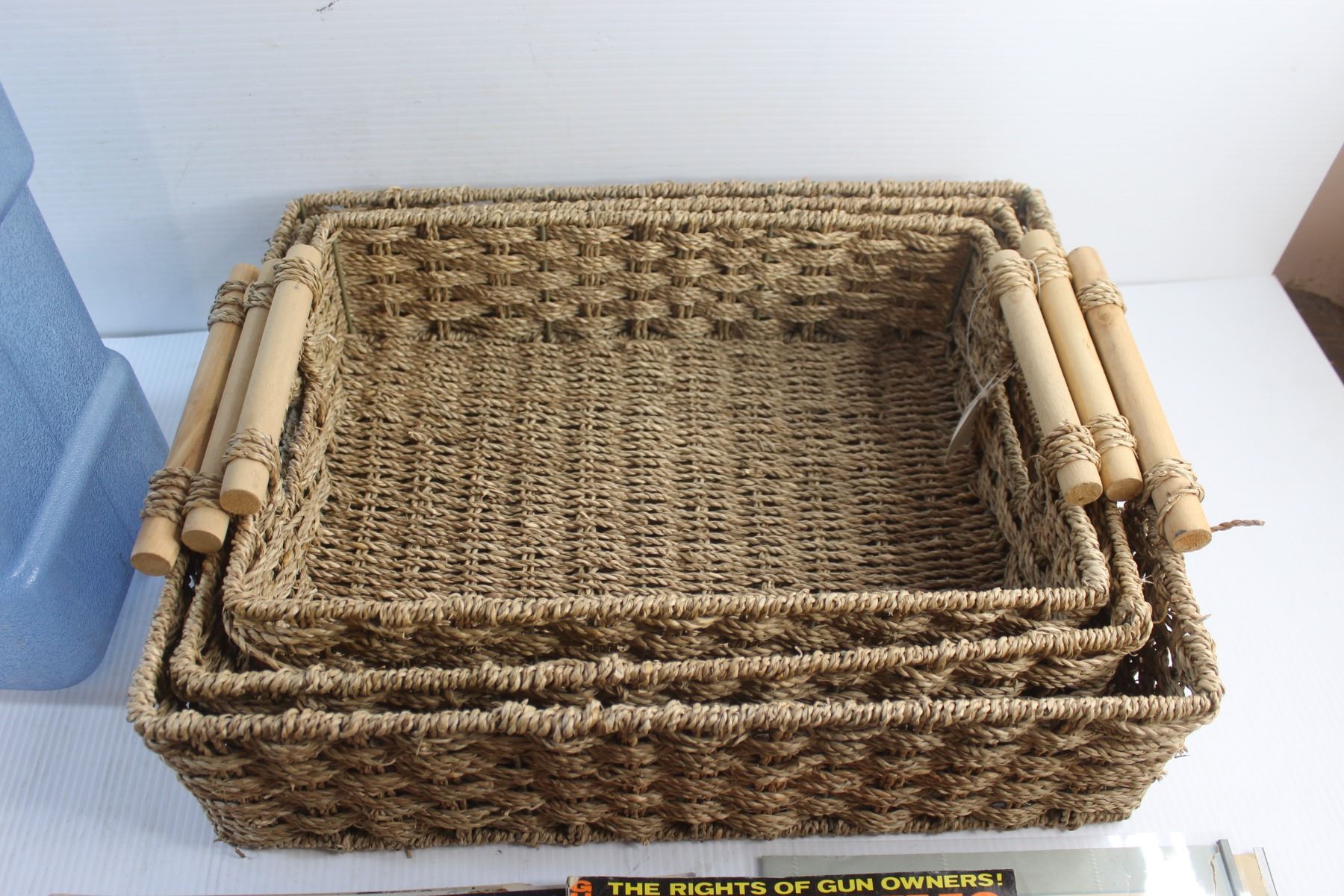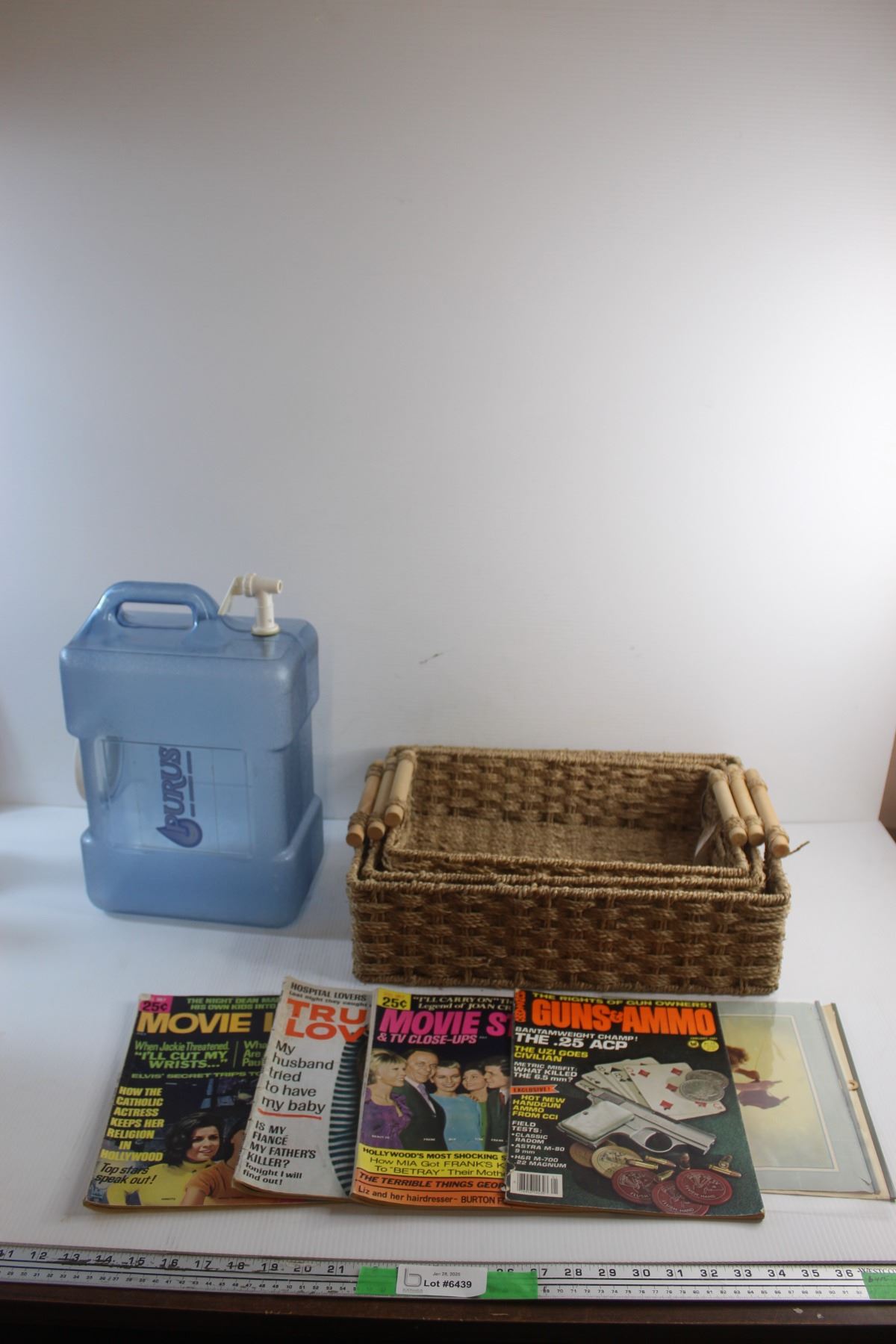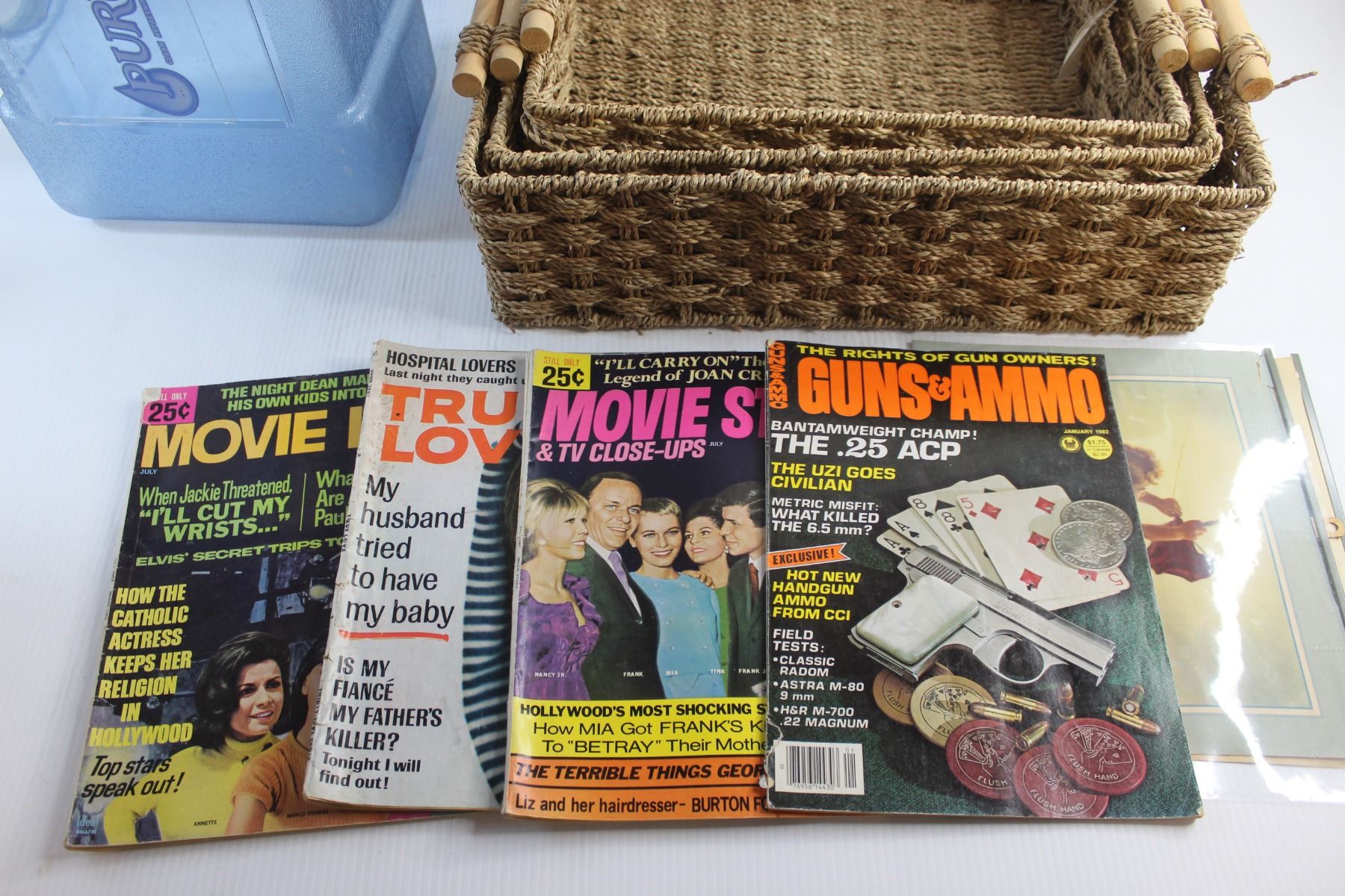 (3) Wicker Baskets, Water Dispenser and Magazines - Guns & Ammo, Movie Life and True Love