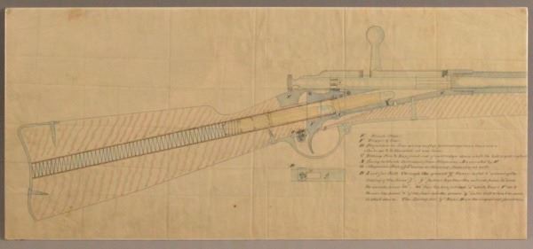 Drawing of pump action shotgun (55-1/2" x 18"); Patent of a lever action rifle (24" x 11"); Proposed improvements for 1916, Musk.