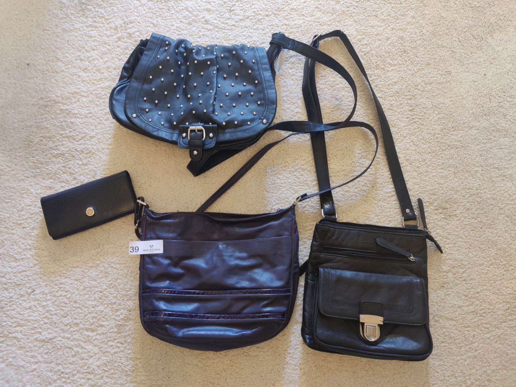 3 Medium sized women's handbags and 1 small trifold wallet.