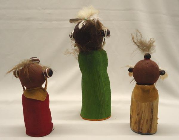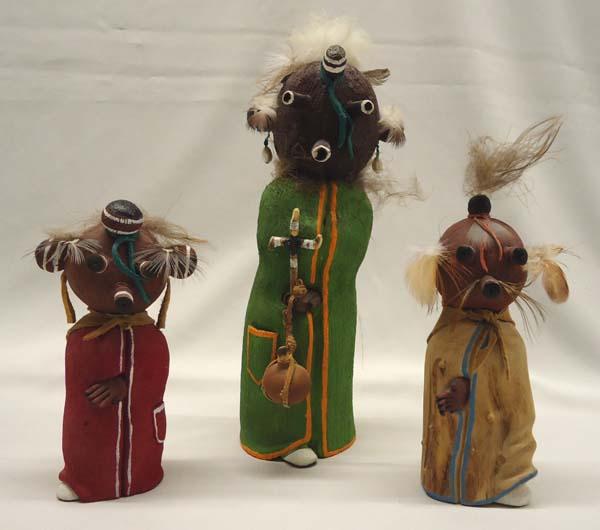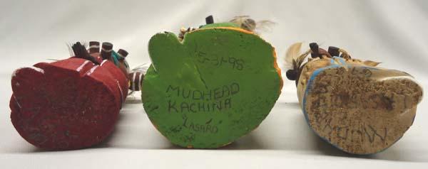 3 Wooden Mudhead Kachinas, tallest measures approx. 9''H x 2 3/4''Diameter. All 3 are signed on the bottom: 5-31-98 Mudhead Kachina, Lasaro. Buyers Pay Actual Shipping and Handling Charges(see terms and conditions for more information).