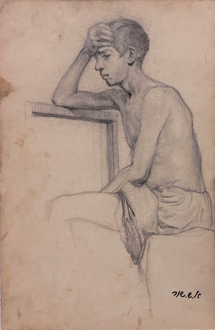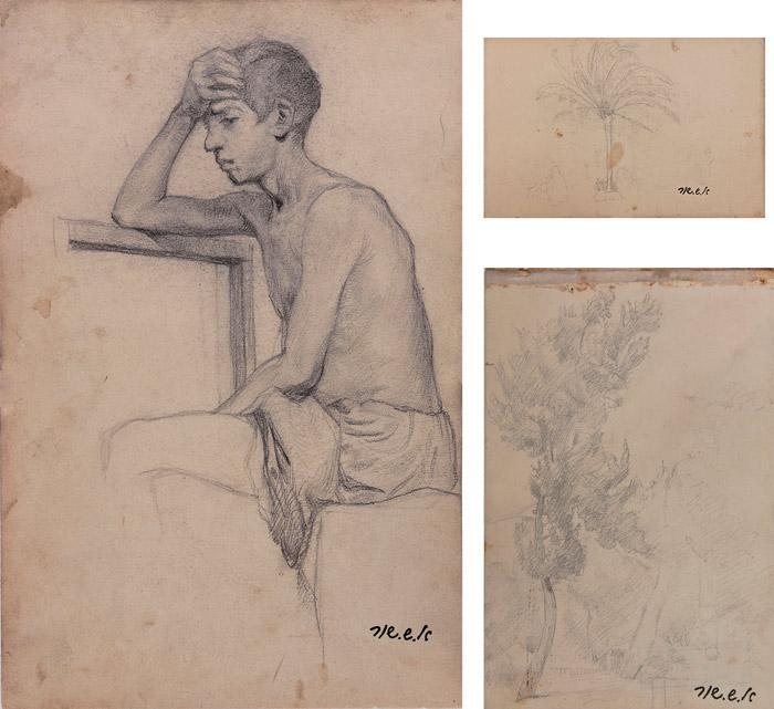 1. "Thinking Boy", stamped by the estate (lower right and on the reverse). Also, sketches of camels on the reverse. Pencil on paper. Size: 28 x 18.5 cm. Condition: Some stains on left edge. (see close-up 2)