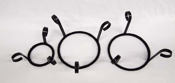 3 Wrought Iron Footed Pot Stands. Wrapped in yarn so they won't harm your favorite pots, 2 measure 7.5'' in diameter and one is 4.25'' in diameter.