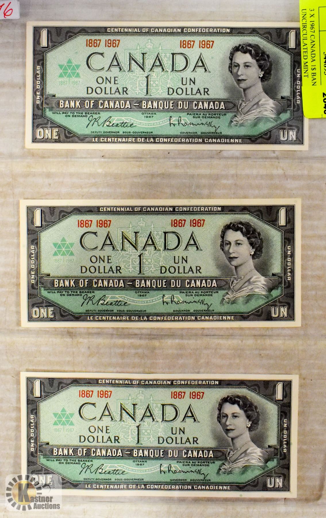 3 X 1967 CANADA 1$ BANK NOTES UNCIRCULATED MINT