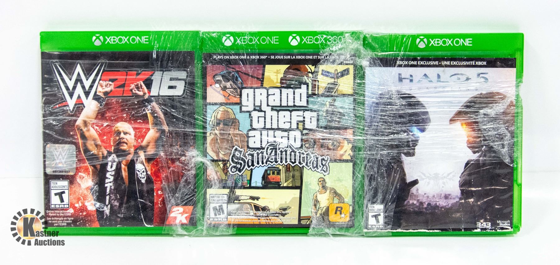 HALO 5, W2K16, GRAND THEFT AUTO SAN ANDREAS (XBOX ONE + XBOX 360) **ALL ITEMS MUST BE REMOVED BY 5PM SATURDAY, JULY 1ST 2023. ALL REMAINING ITEMS WILL BE SUBJECT TO A $6.00 PER DAY STORAGE CHARGE. ANY ITEMS REMAINING AFTER MONDAY, JULY 17TH, 2023 WILL BE CONSIDERED FORFEITED. NO REFUNDS WILL BE ISSUED FOR FORFEITED ITEMS. TO SCHEDULE A PICK UP APPOINTMENT CLICK HERE