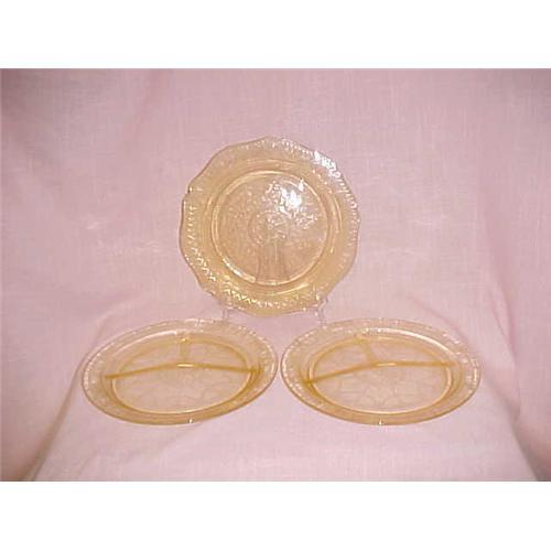 3 Yellow Depression Glass Plates- Two Anchor Hocking Cameo Ballerina Pattern Grill Plates 10.5". One Patrician Amber Dinner Plate 11". Wonderful Collector's pieces! One of the grill plates has a small nick in the bottom, but otherwise all three are in very good condition.