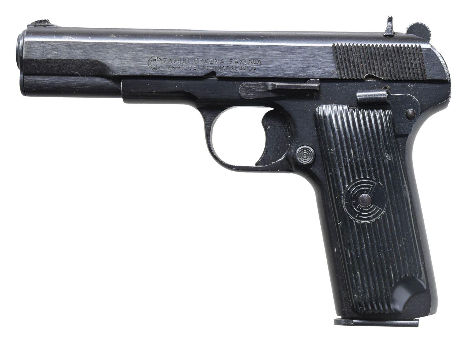 1) M88. Cal. 9x19. S# M88A-40023. Bbl. 3 2/3". Blade front sight. U-notch rear sight. All visible matching numbers. Tokarev style pistol in 9mm Luger. Right side of slide has Century Arms import marking. Right side of frame has importer added serial number. Blued finish. Checkered black Zastava grips. MAGS: 1-8 rd. CONDITION: grips show a couple dings & some handling marks. Metal retains 98% blue with some light handling & edge wear. Action functions properly when hand cycled. Bright near excellent bore. (25-4662/MJC). MODERN. 2) M57 TOKAREV. Cal. 7.62x25. S# E188688. Bbl. 4 1/2". Standard TT-33 style sights. Matching numbers on slide & frame. Top of frame has post-war Yugo crest. Left side of slide has PW Arms import marking. Importer safety is partially present but top part was broken off. Blued finish. Grooved grips with Communist star monograms. MAGS: 1-8 rd. CONDITION: grips show some dings & handling marks. Metal retains 60% arsenal blue with overall fading to gray, scattered edge wear, some oxidation staining & handling marks. Importer added safety not engaging due to top being broken off. Action otherwise functions properly when hand cycled. Very good bright bore with strong rifling. (25-4664/MJC). CURIO. 3) M70A. Cal. 9mm Para. S# 33261. Bbl. 4 5/8". Standard Tokarev style sights. Matching numbers on slide, frame & bbl. Commercial Tokarev style pistol made Zastava. Right side of slide has PW Arms import marking. Left side of slide has commercial Zastava markings. Manual safety. Blued finish. Grooved black grips. MAGS: 1-9 rd. CONDITION: grips show some dings & handling marks. Metal retains 95% blue with some handling marks, light edge & operational wear. Action functions properly when hand cycled. Bright near excellent bore. (25-4671/MJC). MODERN. $700-1,000.