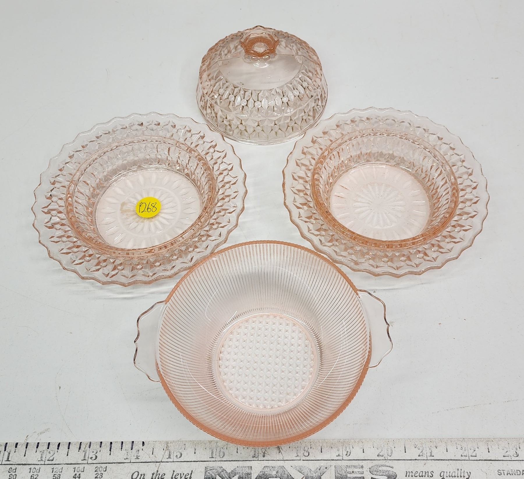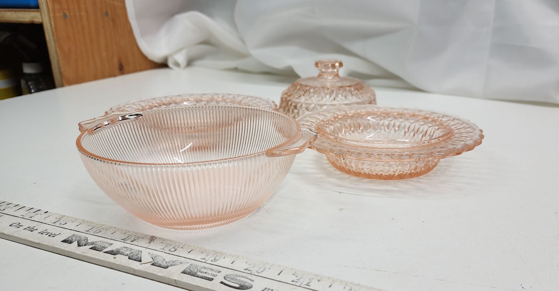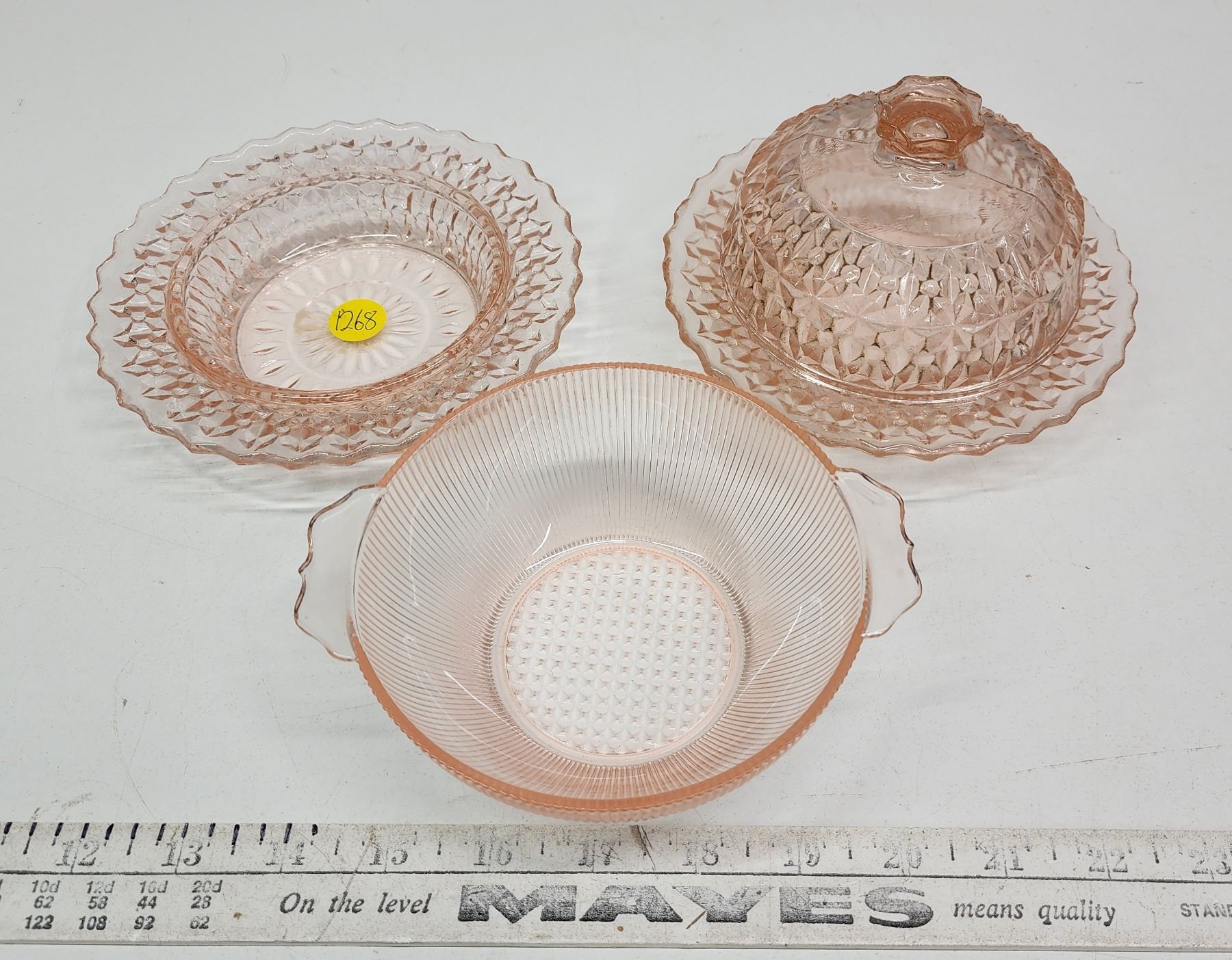 3 assorted pink depression glasswares - butter dish, with lid and without, etc.