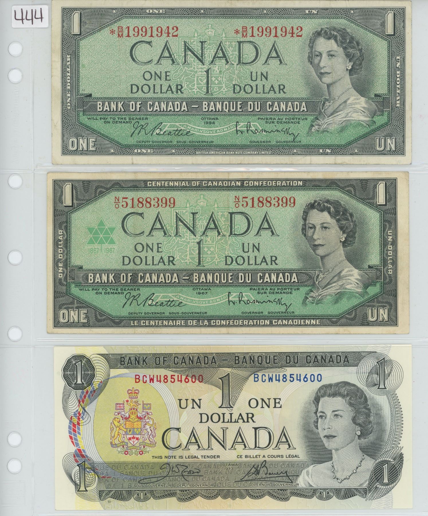 3-bills, 1-1954 one dollar replacement note, 1-1967 one dollar bill & 1-1973 one dollar bill ($3.00 face),3-Canadian bills