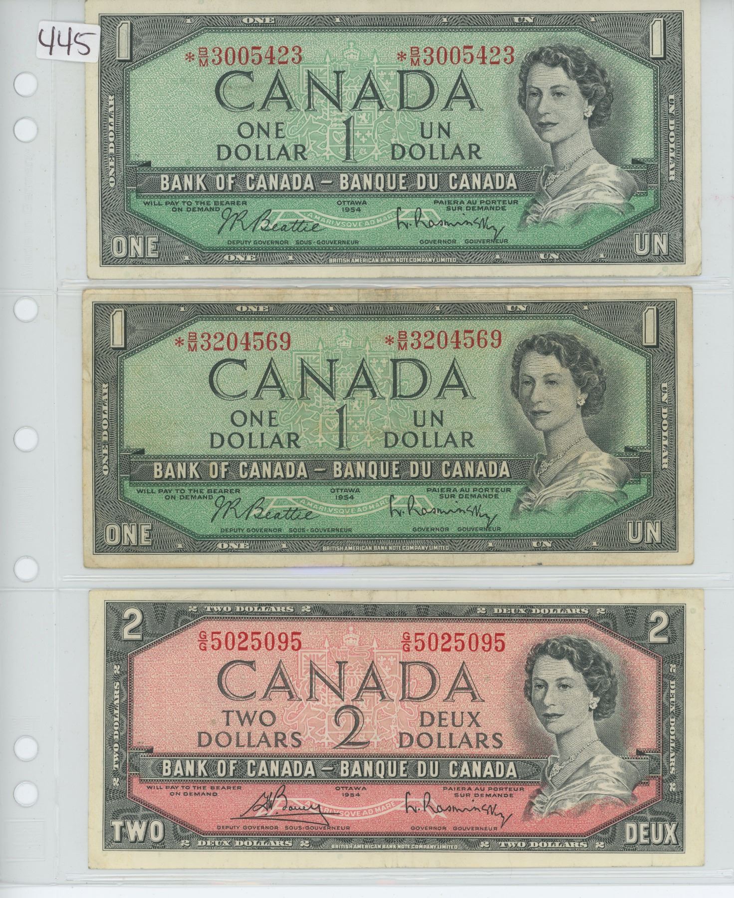 3-bills, 2-1954 one dollar replacement notes, 1-1954 two dollar bill ($4.00 face),3-Canadian bills