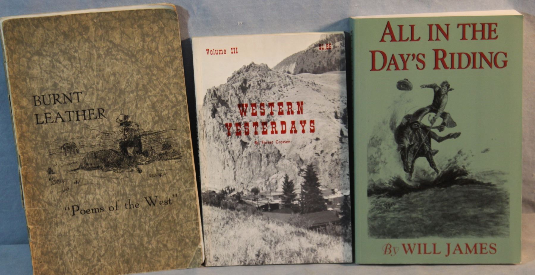 3 books: Horan, Poems of The West, soft cover; James, Will, All In A Days Riding, soft cover; Crossen, Forest, Western Yesterdays, soft cover, 1965, Vol. III