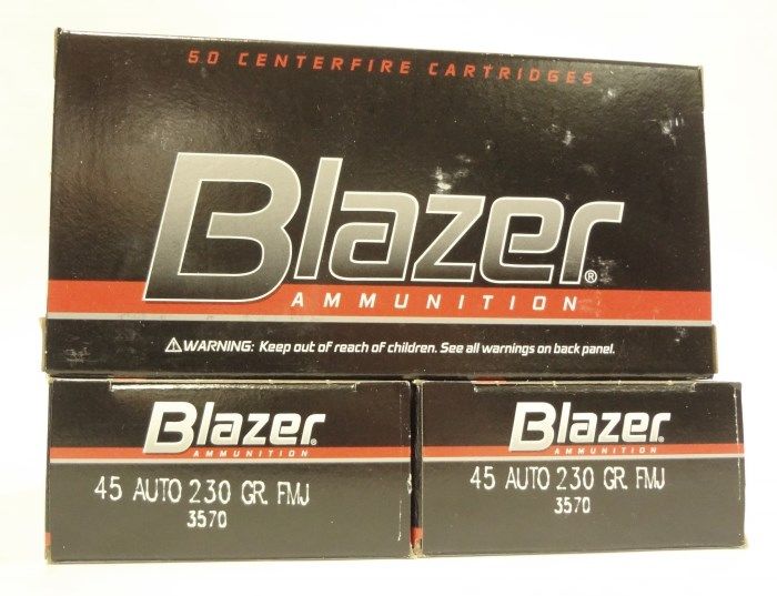 3 boxes CCI Blazer .45 ACP 230 Grain FMJ Ammo. 50 rounds per box. EST $85-$95