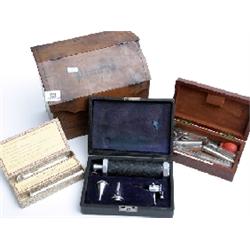 3 boxes of medical instruments, syringes, pen light with mirror, and cased ear light