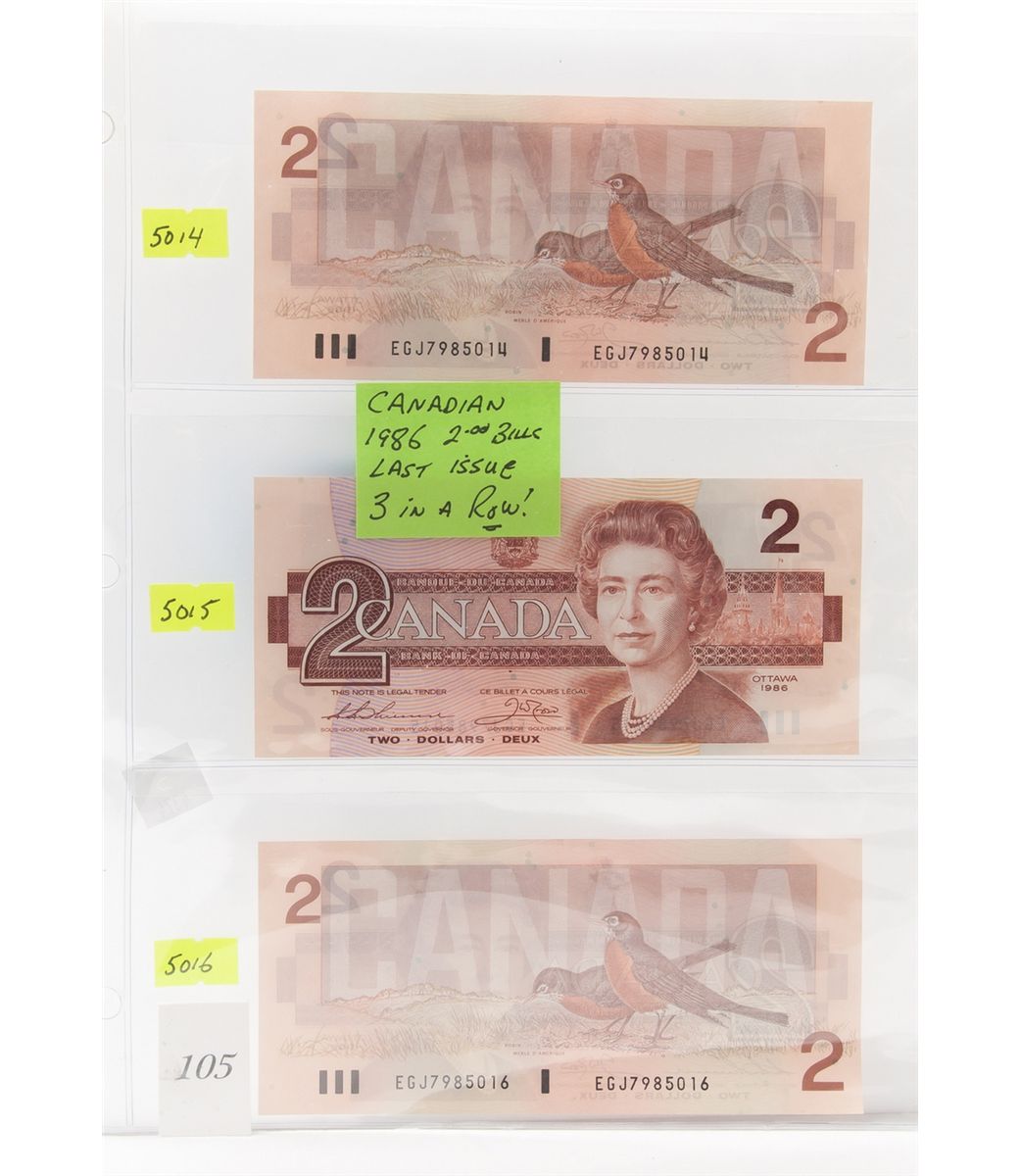 3 canadian 1986 last issue 2 dollar bank notes *NO SHIPPING AVAILABLE*