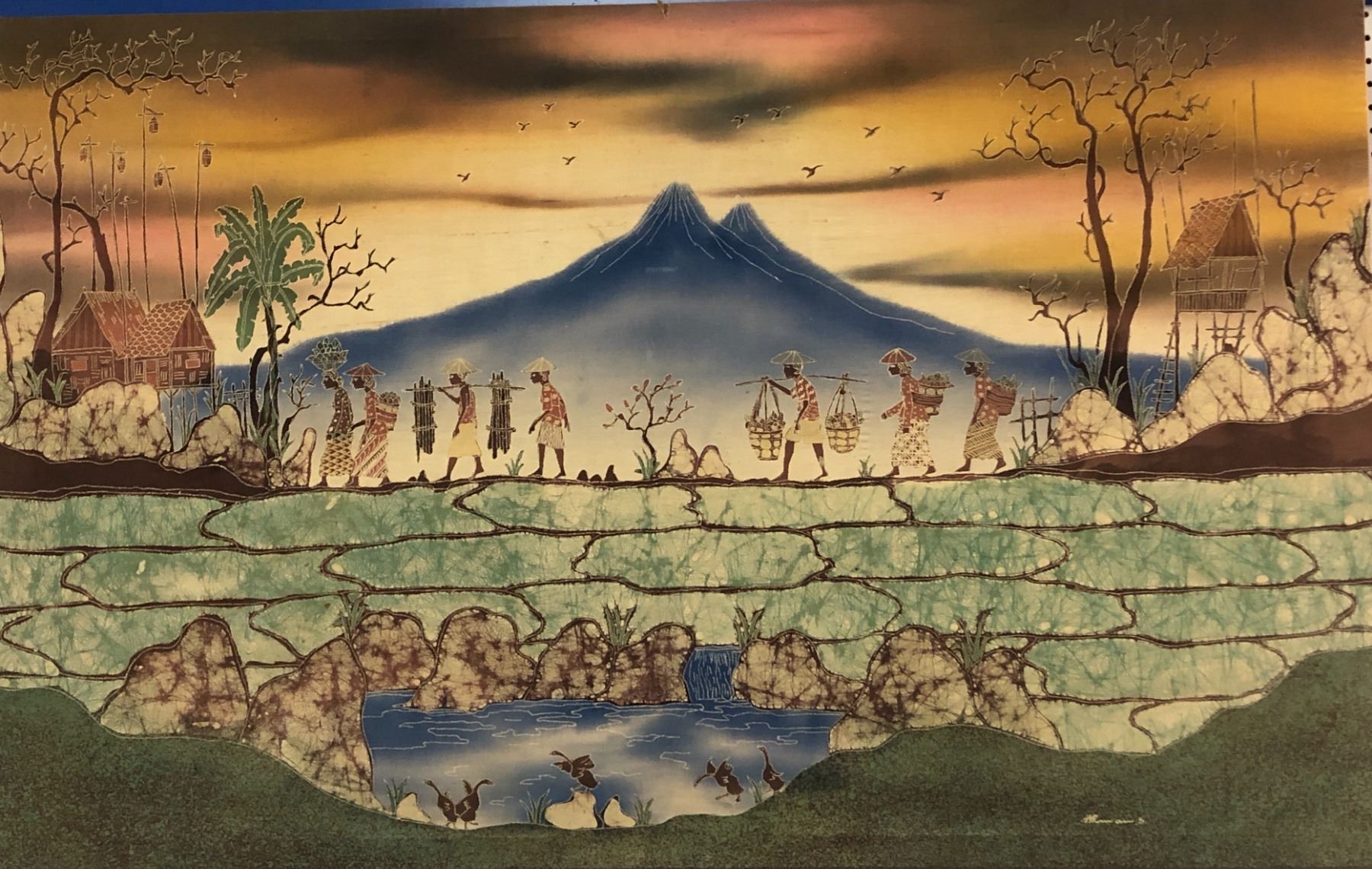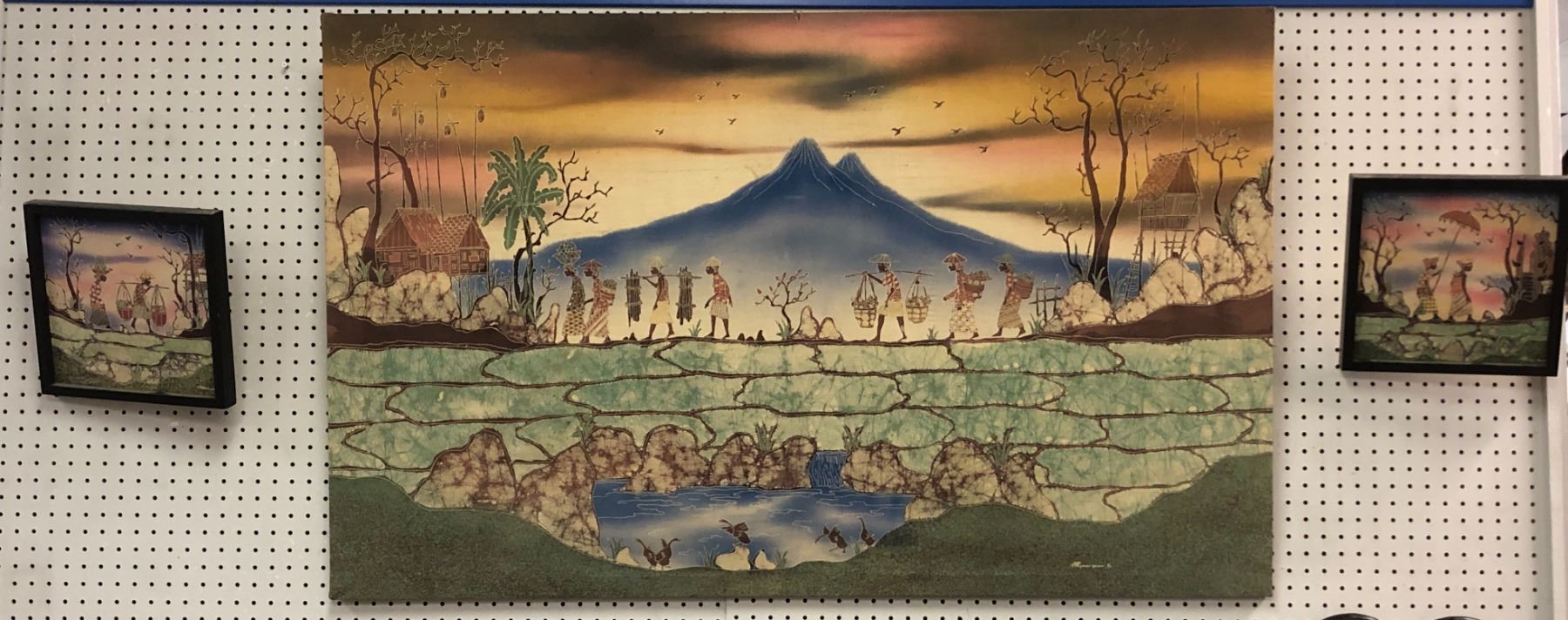 3 classical style Indonesian Batik Tulis hand print paintings on cotton fabric (approx 33 1/2" length x 54" wide & approx 12" 11 1/2")