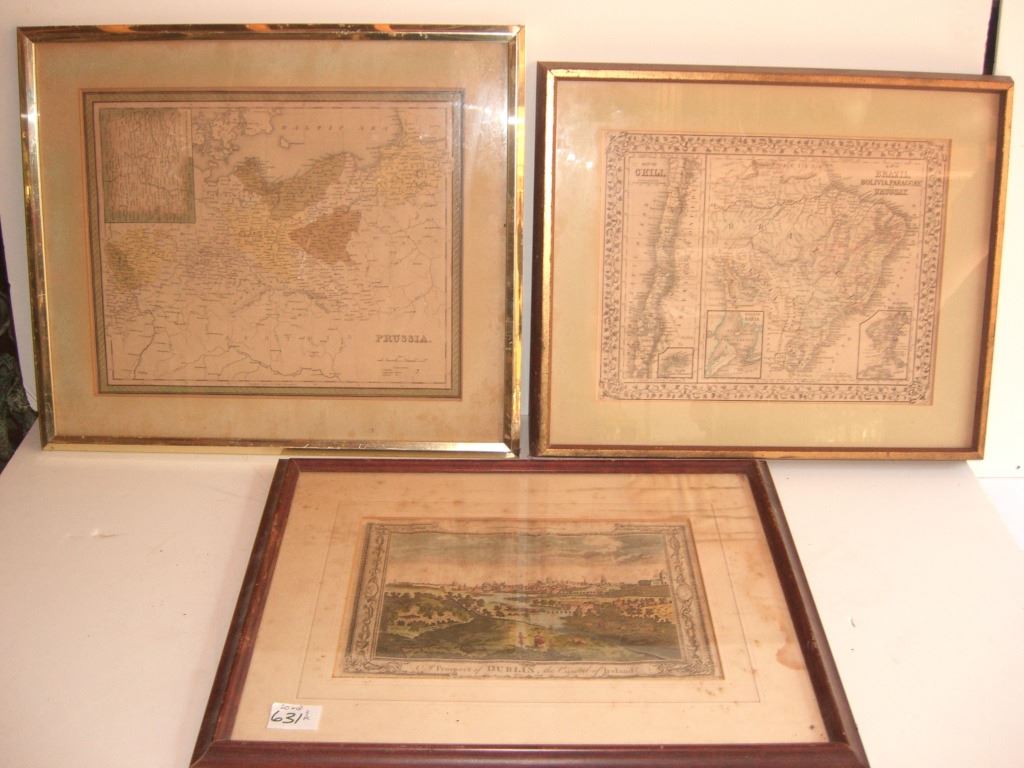 3 colored engravings including "A Prospect of Dublin" colored engraving; Map of Brazil, Bolivia, Paraguay & Uruguay; Map of Prussia. Foxing; creases. Largest measures 20 inches x 18 inches.