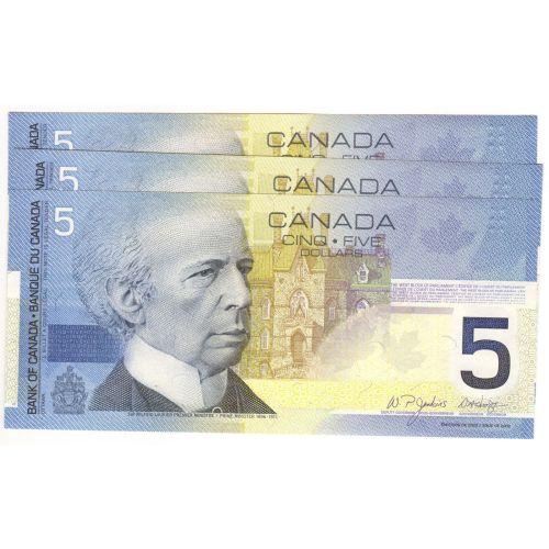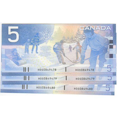 Bank of Canada, 3 consecutive $5.00 Insert note 2005 (Radar insert + 2 notes insert before), grade Choice UNC, Charlton # BC-62bA, signature Jenkins Dodge, serial HOS0849478-79-80, insert range 0.800M - 1.000M. Lot includes the radar and 2 notes before.