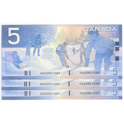 Bank of Canada, 3 consecutive $5.00 Insert notes 2005 (Radar insert + shoulder notes insert), grade Choice UNC, Charlton # BC-62bA, signature Jenkins Dodge, serial HOS0901089-90-91, insert range 0.800M - 1.000M. Lot includes the radar and both notes before and after.