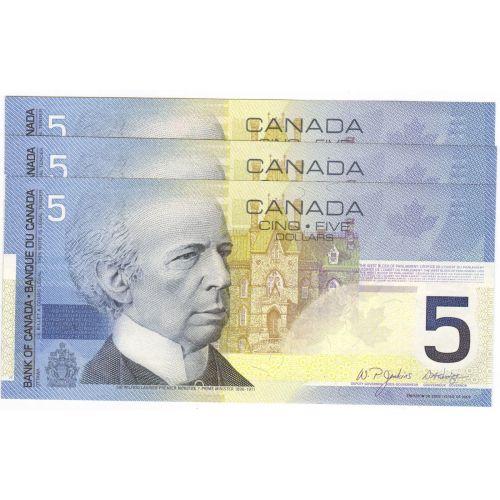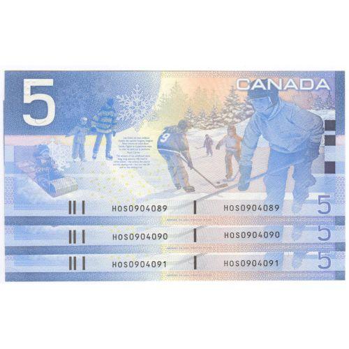 Bank of Canada, 3 consecutive $5.00 Insert notes 2005 (Radar insert + shoulder notes insert), grade Choice UNC, Charlton # BC-62bA, signature Jenkins Dodge, serial HOS0904089-90-91, insert range 0.800M - 1.000M. Lot includes the radar and both notes before and after.