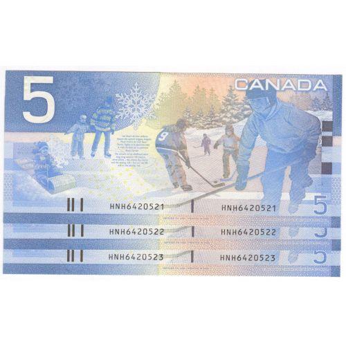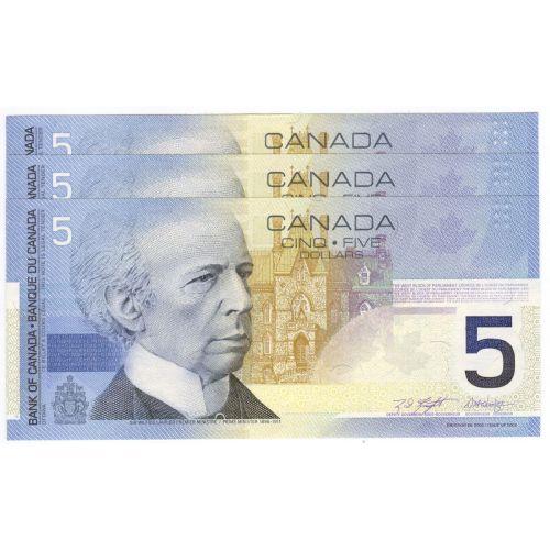 Bank of Canada, 3 consecutive $5.00 Replacement notes 2003, grade Gem UNC, Charlton # BC-62aA-i, signature Knight Dodge, serial HNH6420521-22-23, insert range 6.400M - 6.580M. Problem free notes.