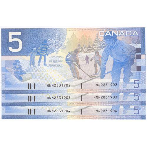 Bank of Canada, 3 consecutive $5.00 changeover notes 2003, grade Gem UNC, Charlton # BC-62a-i, signature Knight Dodge, serial HNN2831902-03-04, also birthday notes for people born or March 3, 1902-1903-1904. Problem free notes.