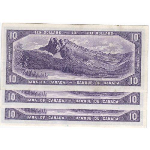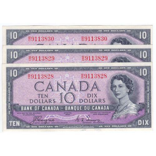 Bank of Canada, 3 consecutive $10.00 Devil's Face note 1954, grade VF/EF, Charlton # BC-32a, signature Coyne Towers, serial B/D9113828-29-30. Lots of 3 notes.