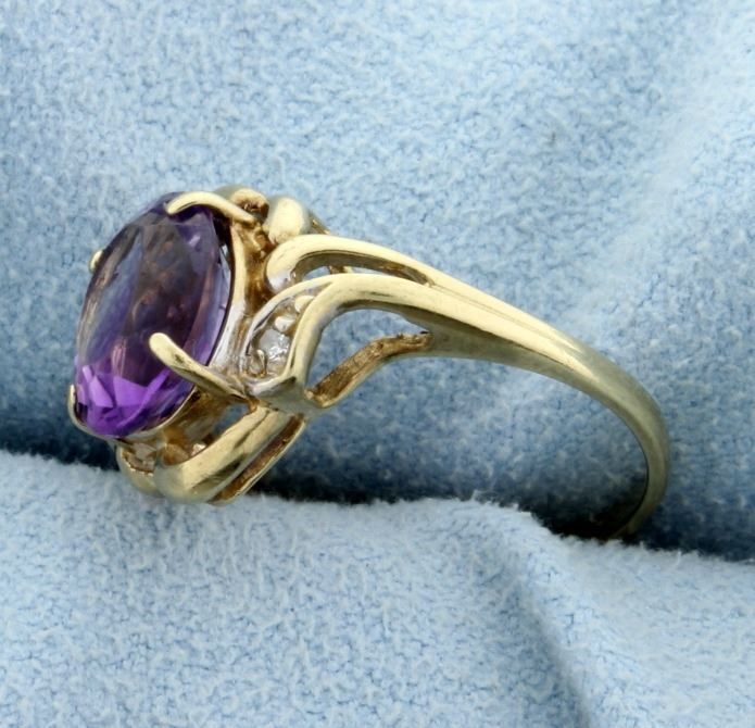 In 10K yellow gold, there is one 10x8mm oval amethyst and two .01ct diamonds. Size 6 1/2 2.8g