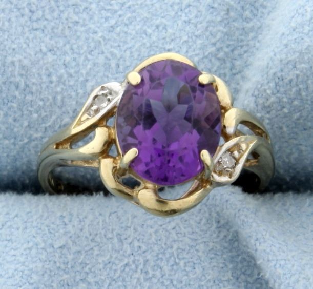 In 10K yellow gold, there is one 10x8mm oval amethyst and two .01ct diamonds. Size 6 1/2 2.8g